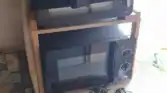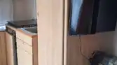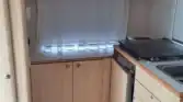 Vzadu je kuchyňská linka s lednicí, dřezem, plynovým sporákem se 3 hořáky, dále koupelna s umyvadlem a WC, malá a velká skříň, plynové topení.