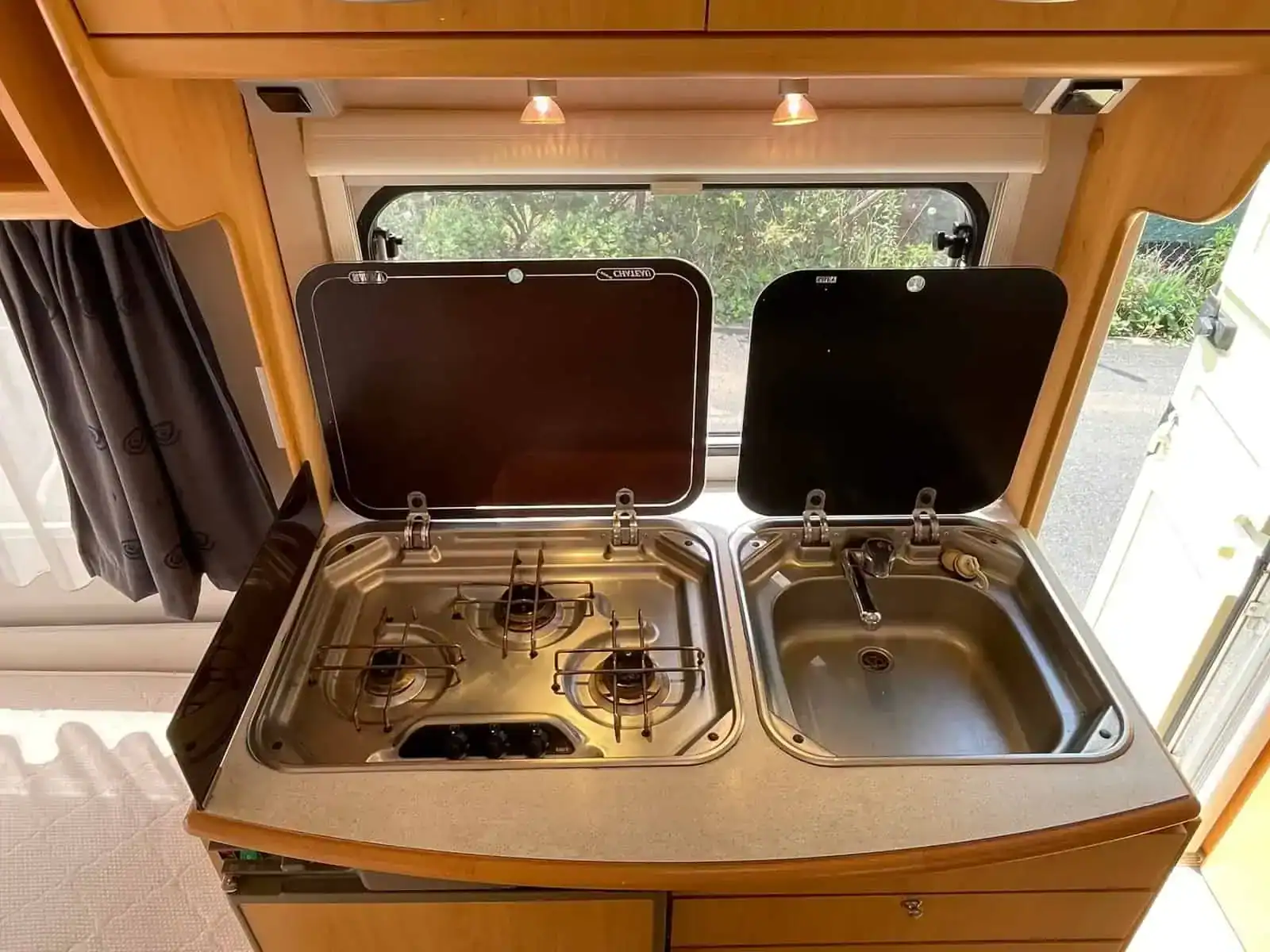 Uprostřed karavanu je umístěna kuchyňská linka s nerezovým dřezem, tříplotýnkovým plynovým vařičem a lednicí (napájení 12V / 230V / plyn) s mrazákem.