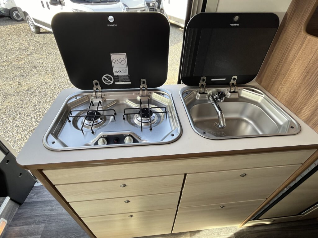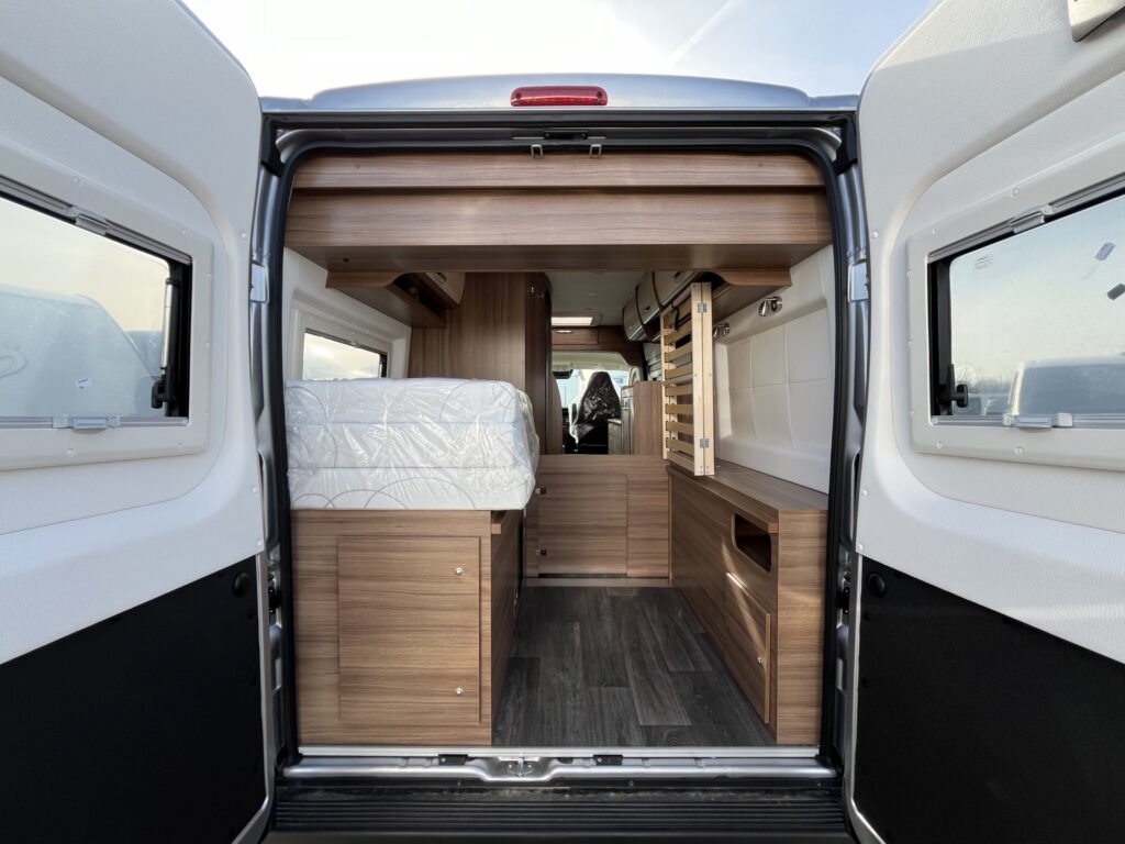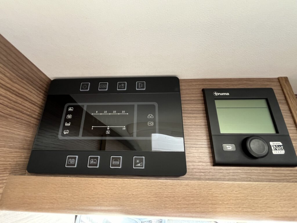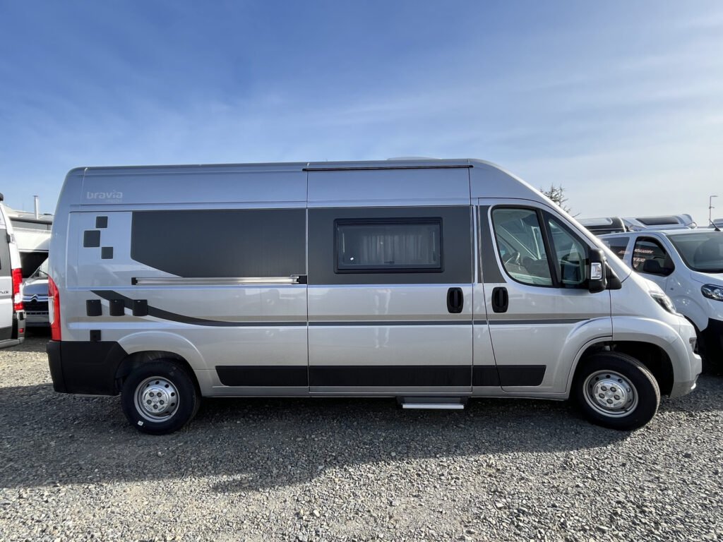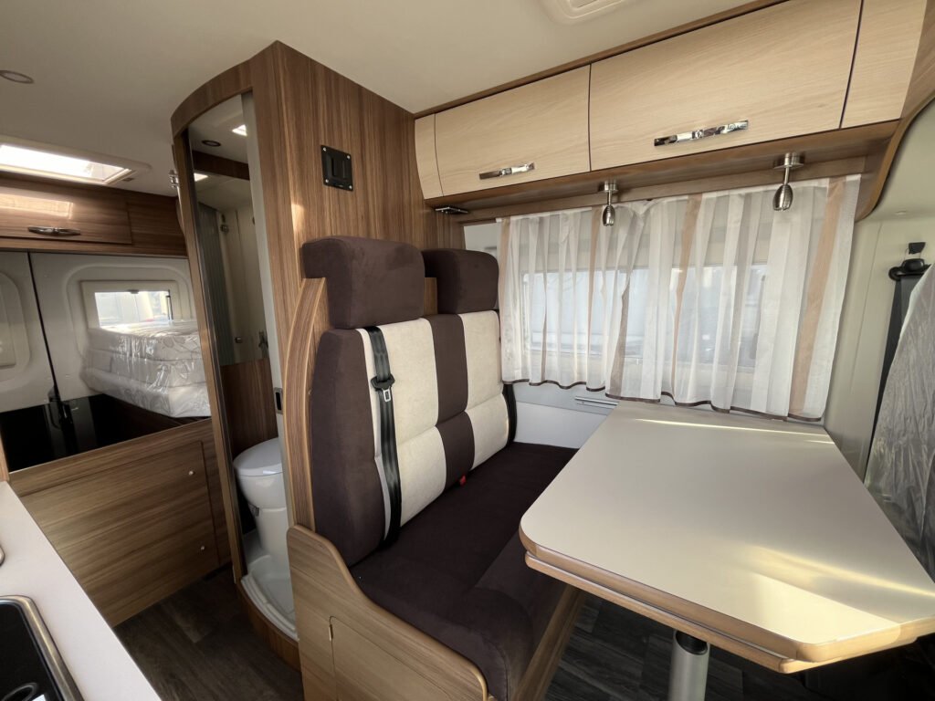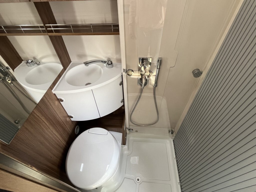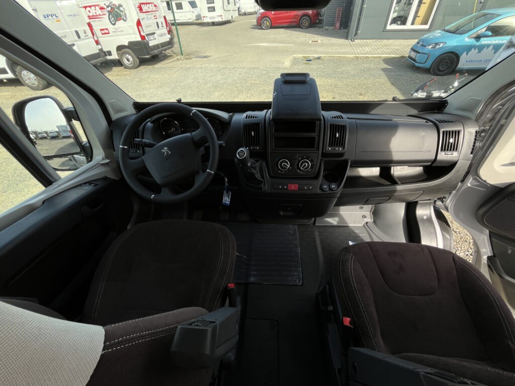 Další příplatková výbava skladového vozu: motor 165 PS, barva Artense Grey, přední nárazník v barvě vozu, LED denní světla, elektronický Drive Control vč. asistenta sjezdu z kopce, topení Truma Combi 4KW E CP Plus, DuoControl CS, držák TV, příprava pro klimatizaci, vyhřívaná odpadní nádrž, venkovní přípojka na vodu, plyn a elektro (220V/12V/SAT), extra boční okno