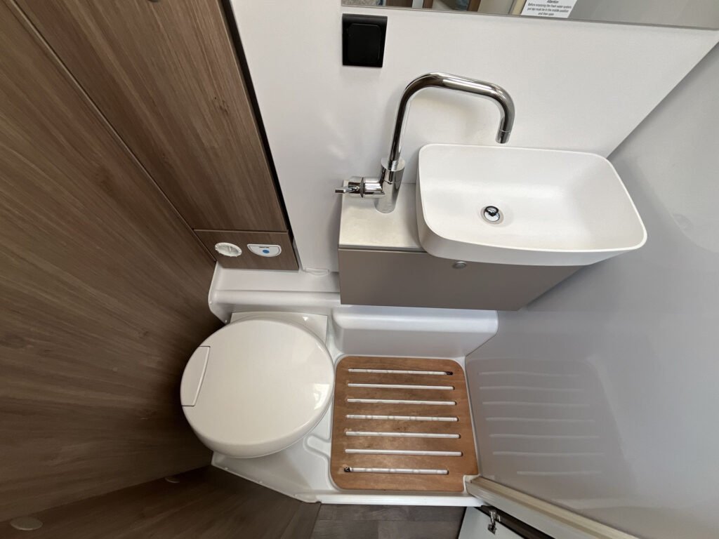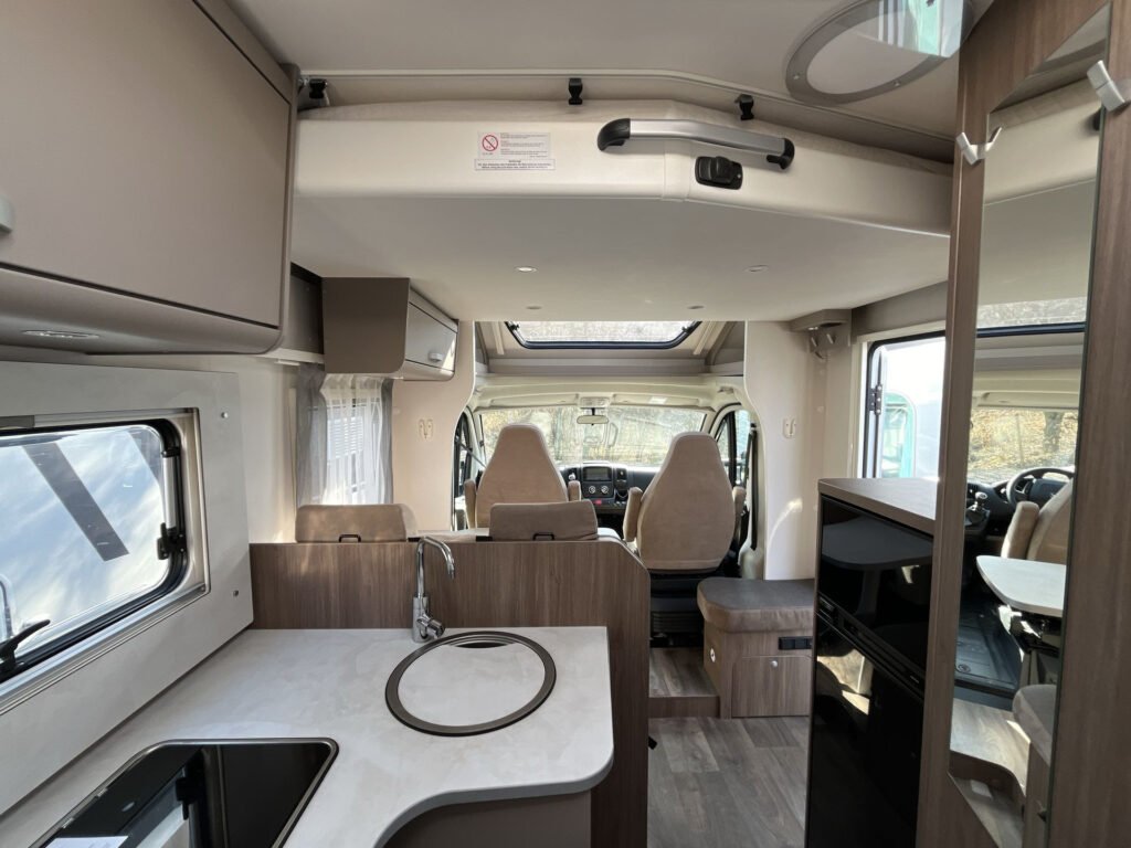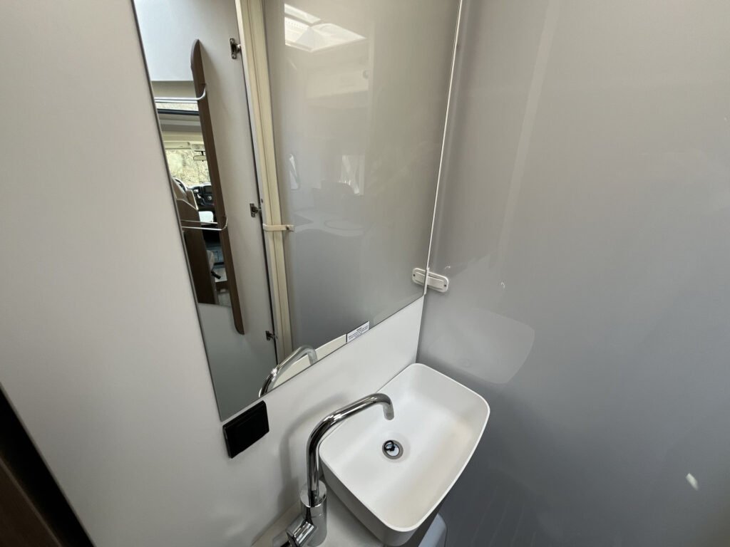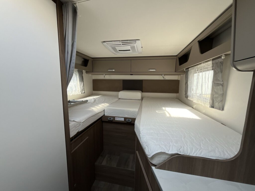 Standardní výbava: Přední otočná sedadla Captain Chair, airbag řidiče a spolujezdce, motorová klimatizace manuální, tónovaná a elektricky ovládaná okna v kabině řidiče, centrální zamykání dveří v kabině řidiče, palubní počítač s ukazatelem vnější teploty, DAB anténa ve zpětném zrcátku, držák na telefon / tablet vč. USB zásuvky, dojezdová sada pro pneu Fix & Go Kit, příprava rádia vč. 4 reproduktorů, přední nárazník v barvě vozidla, 7 let záruka na těsnost nástavby, střecha a zadní stěna odolná proti krupobití, polohovatelná dvojitá boční okna s roletou a sítí proti hmyzu, prostorná garáž se zatížením 150 kg, elektrický vstupní schůdek, LED osvětlení interiéru a exteriéru, výkonná baterie AGM 95 Ah pro obytnou část, kontrolní panel nástavby, vnitřní zásuvky 230V, vnější připojení pro 230V s jističem, USB zásuvka, centrální osvětlení u vstupních dveří, plynové topení Combi 6 s integrovaným 10 l bojlerem, kuchyňská deska s nerezovým dřezem a skleněným krytem, tříhořákový vařič s pojistkou hoření a se skleněným krytem, LED osvětlení nad kuchyňskou linkou, pákové mísící baterie v kuchyni i koupelně, nádrž čisté vody vč. bojleru 122 litrů, odpadní nádrž 92 litrů, WC s elektrickým splachováním, skříňka se zrcadlem, integrované LED osvětlení, střešní okno s ochrannou síťkou, ergonomicky tvarované sedáky, komfortní matrace s odnímatelnými potahy na všech lůžkách, laťový rošt na pevných lůžkách, Isofix pro 2 sedačky.