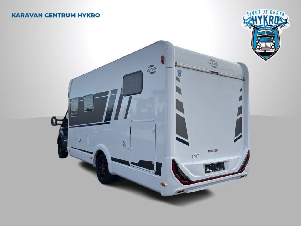 PROVEDENÍ EDITION24 ZAHRNUJE TUTO VÝBAVU: barva podvozku Chroma-Blue, 16″ litá kola, polepy Carado Alternativ, plynové topení Truma Combi 6, druhé garážové dveře 80×85 cm, izolovaná odpadní nádrž, markýza 4.5 m, zatemňovací žaluzie v kabině řidiče, velká lednice 156 l s odděleným mrazákem 29 l, okno na toaletě, rámová okna, interiér obytné části v šedé barvě, designové polepy Edition24
