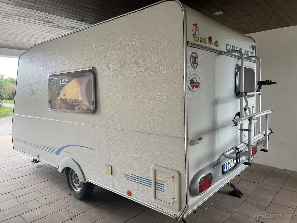 Ideální pro začátečníky svou šířkou 2m, a váhou jen 720 kg. Vhodný i pro tahání menšími auty. Nosiče na 4 kola. Velká postel, WC, spaní pro 3-4 osoby. Nový , rok starý předstan včetně podlahy.