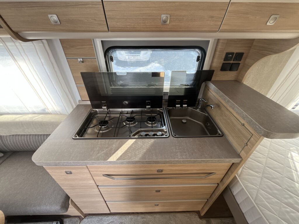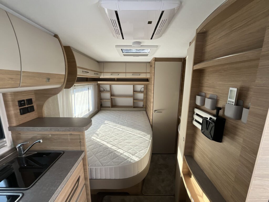 Výbava: mover Truma, klimatizace Truma, koberec nástavby, sáčková markýza, inteligentní plynový regulátor DuoControl, sprcha, podložky pod stabilizační vzpěry Bigfoot, městská přípojka na vodu, BATTERY PACK