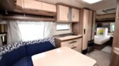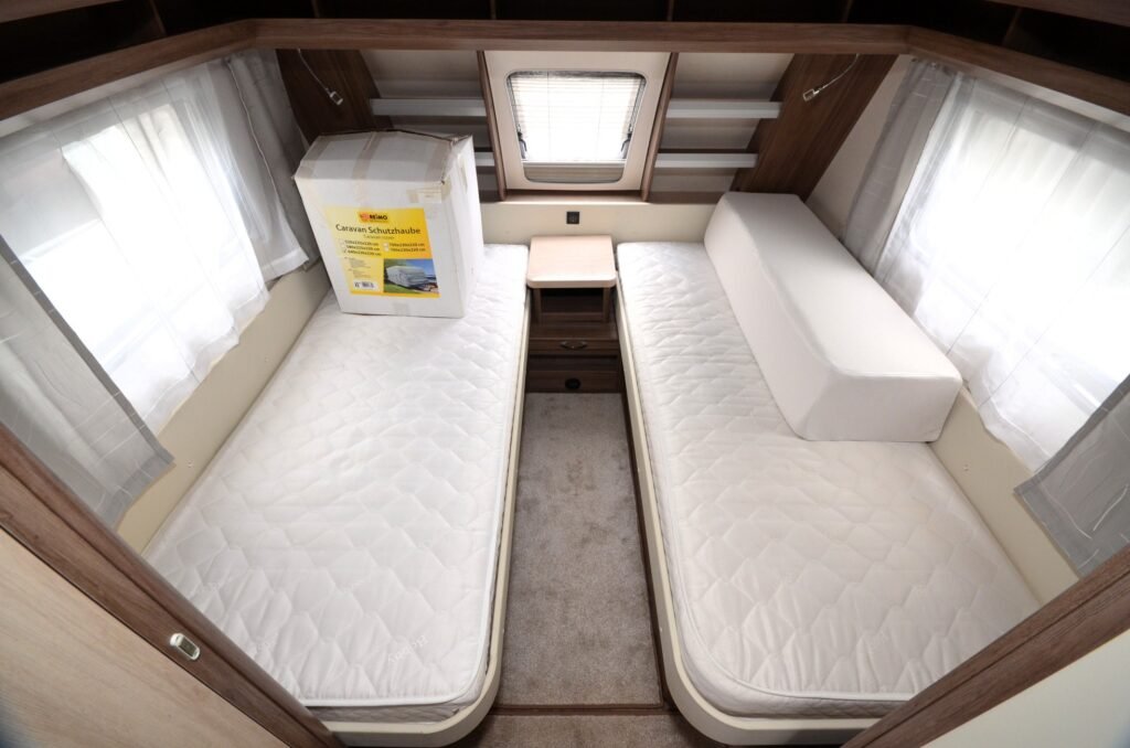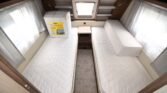 Spaní pro 4 osoby. V přední části karavanu se nachází dvě samostatná lůžka, které je možné spojit v prostorné letiště. Sezení v zadní části se pak rozkládá na další prostor pro spaní.