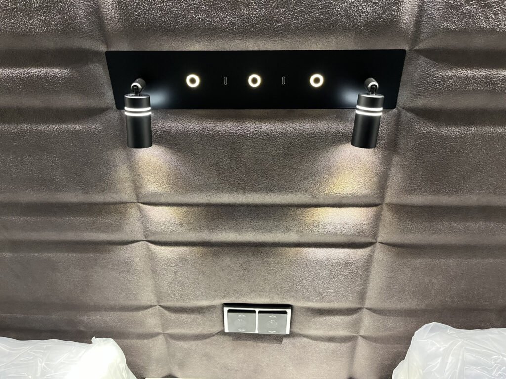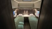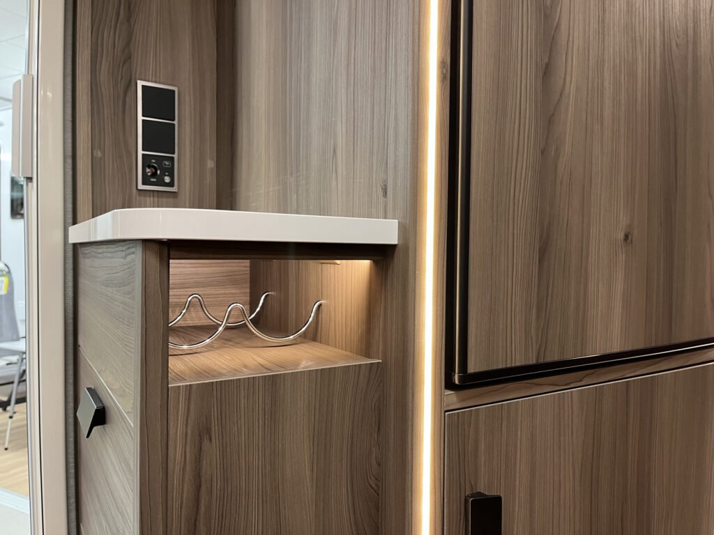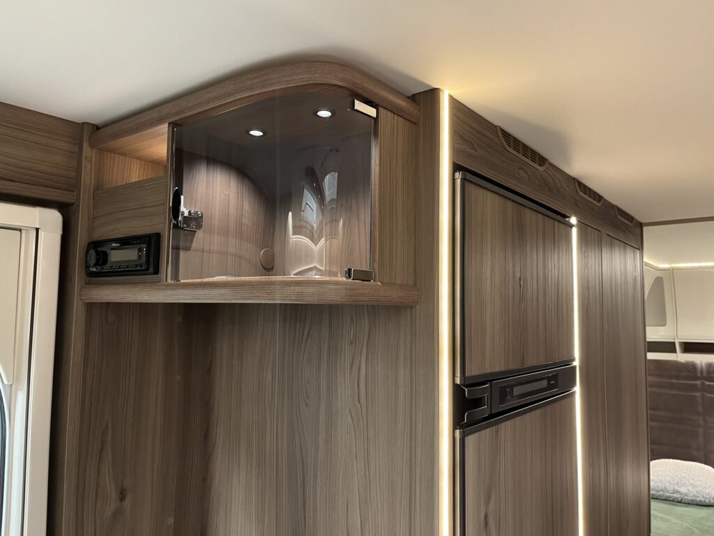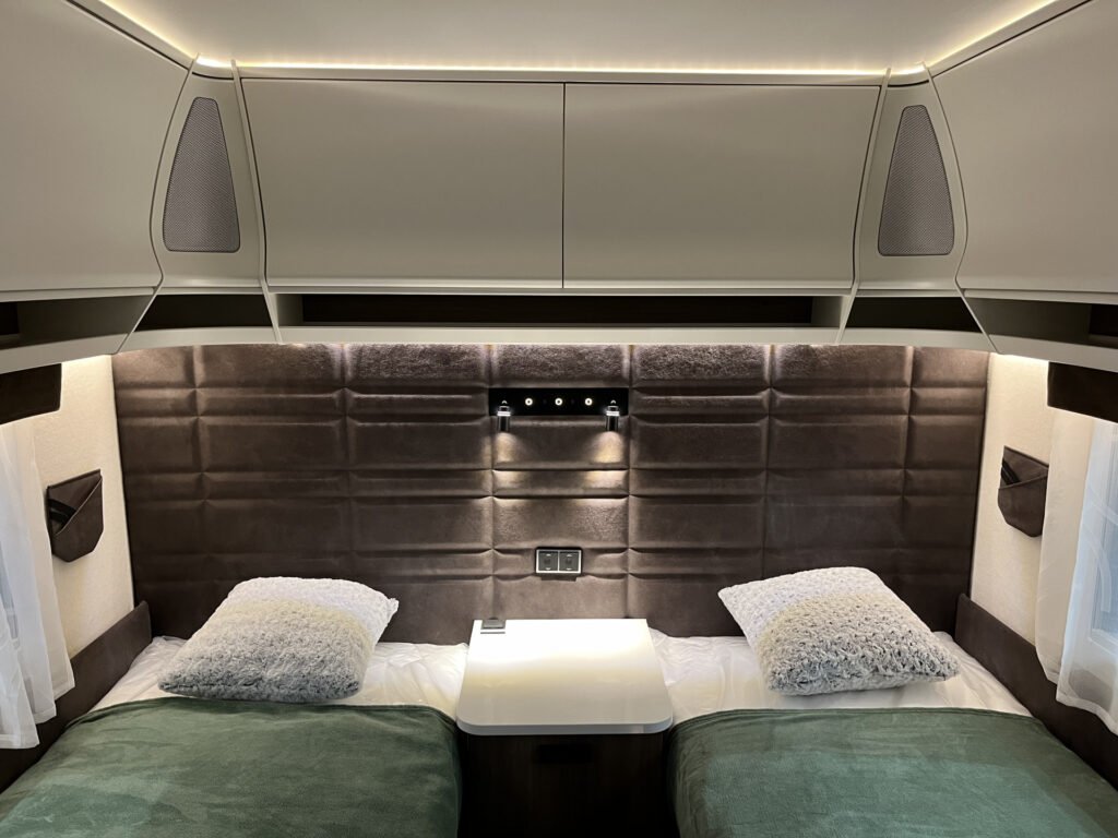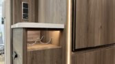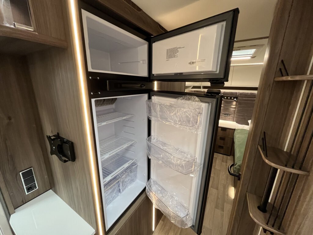 Comfort paket: velká kompresorová lednice s mrazákem, opěrka hlavy u sezení, servisní úložný prostor, sušák na ručníky, elektricky nastavitelné čelo postele