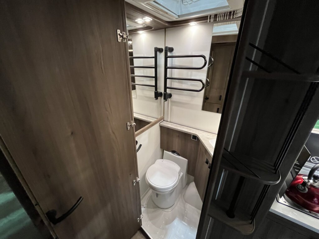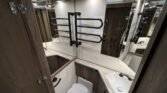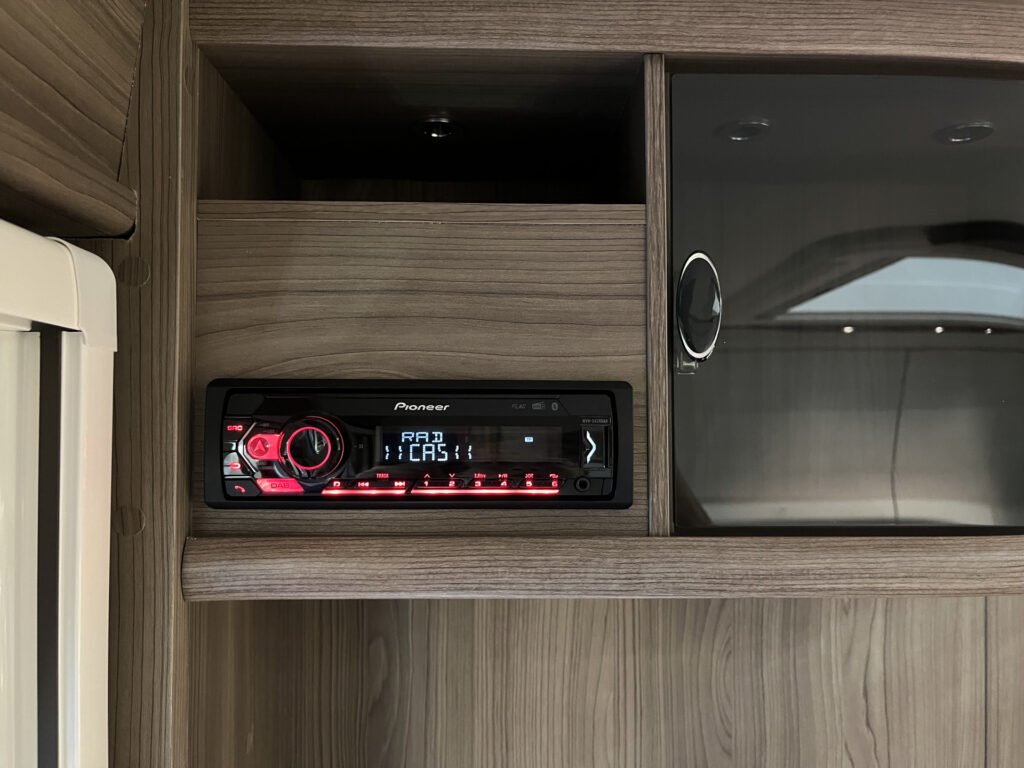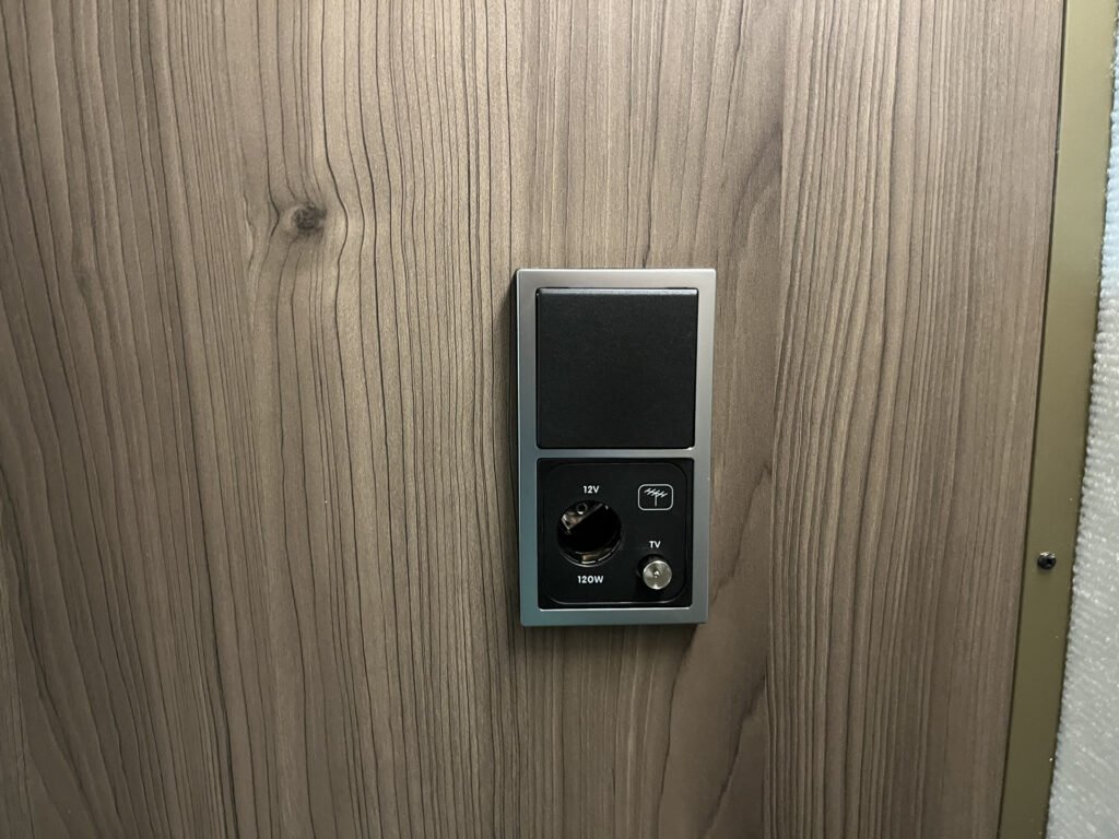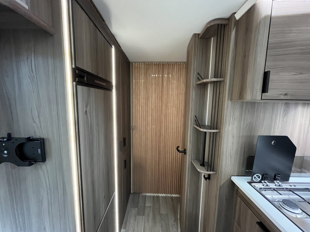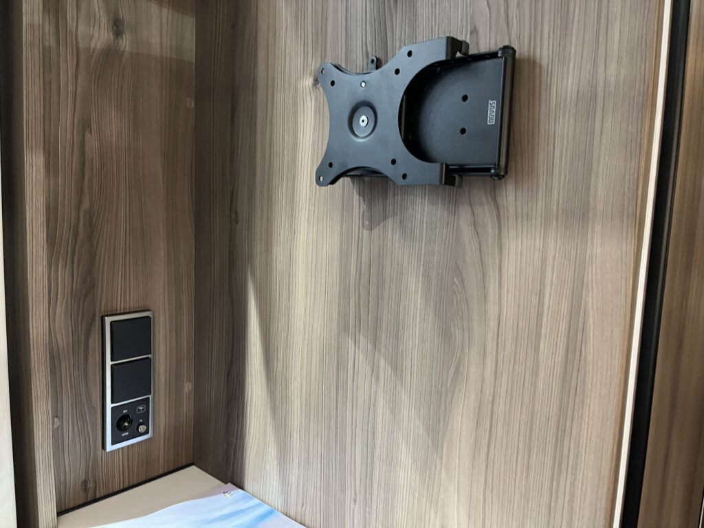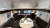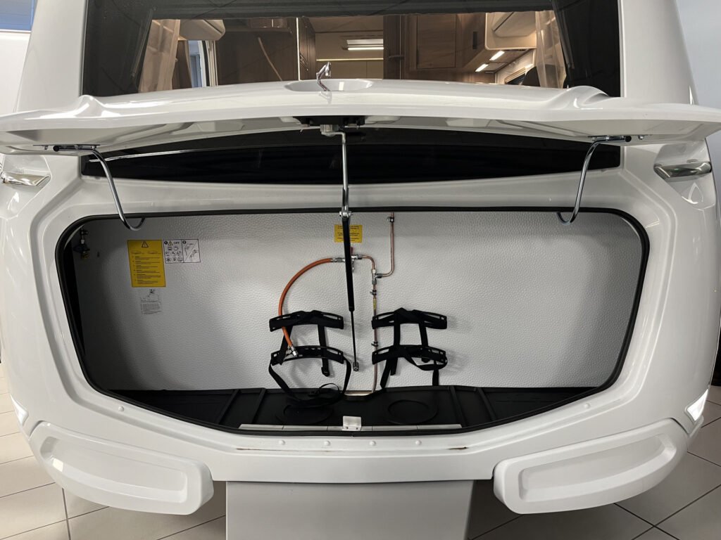 Comfort paket: velká kompresorová lednice s mrazákem, opěrka hlavy u sezení, servisní úložný prostor, sušák na ručníky, elektricky nastavitelné čelo postele