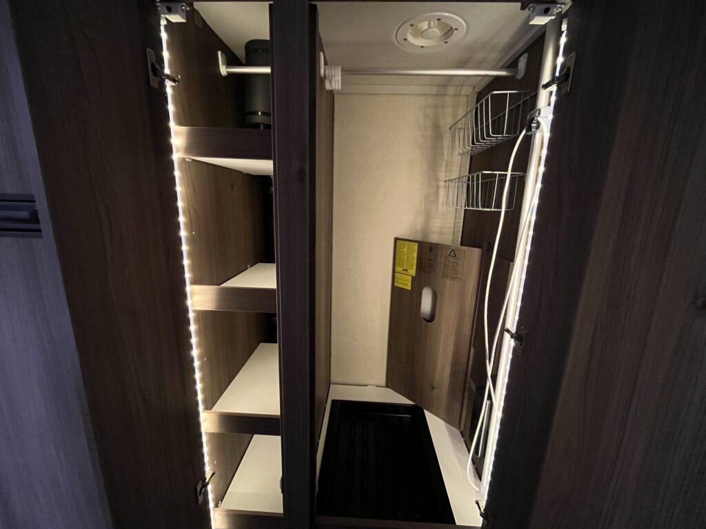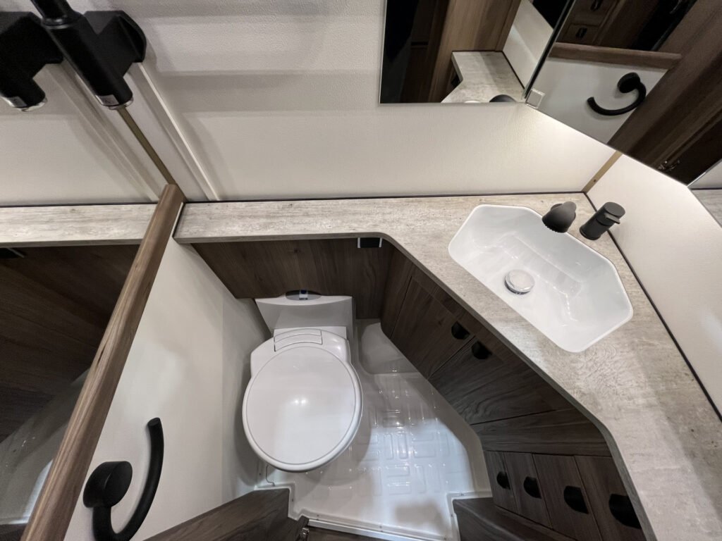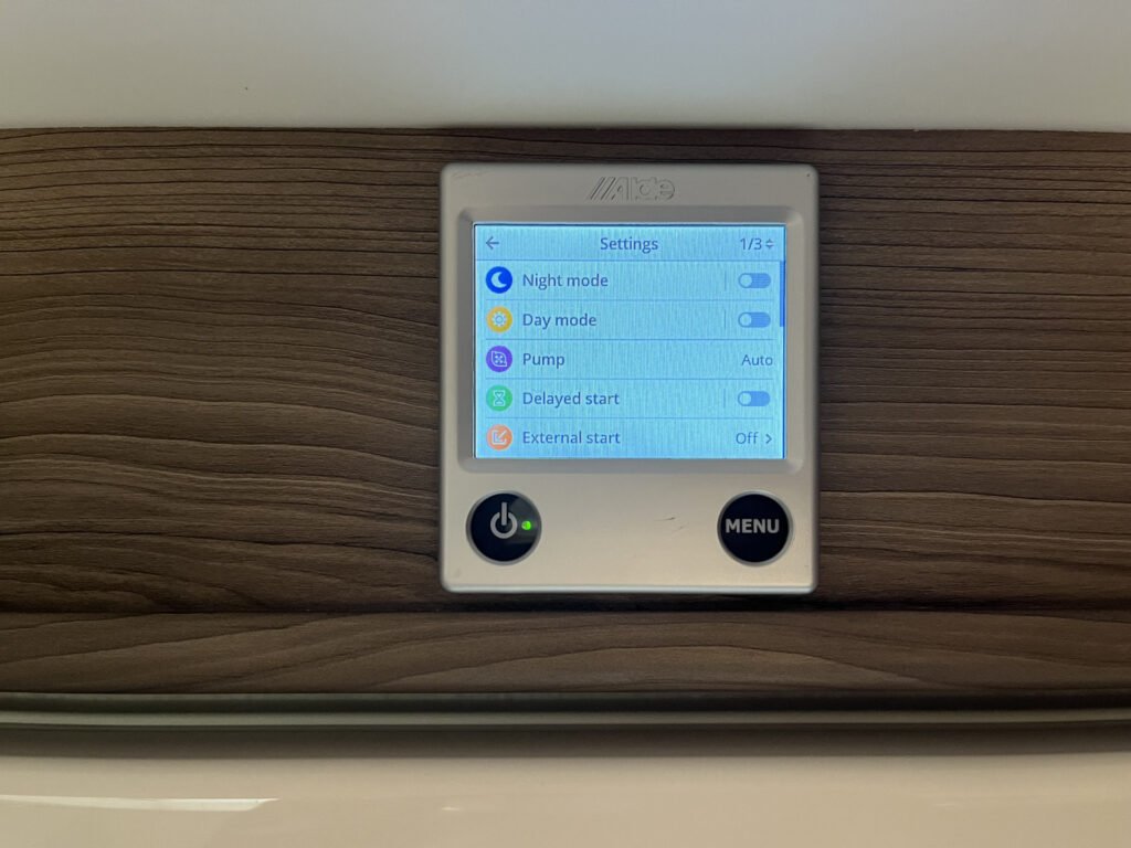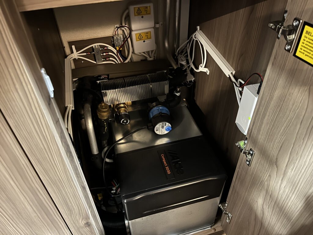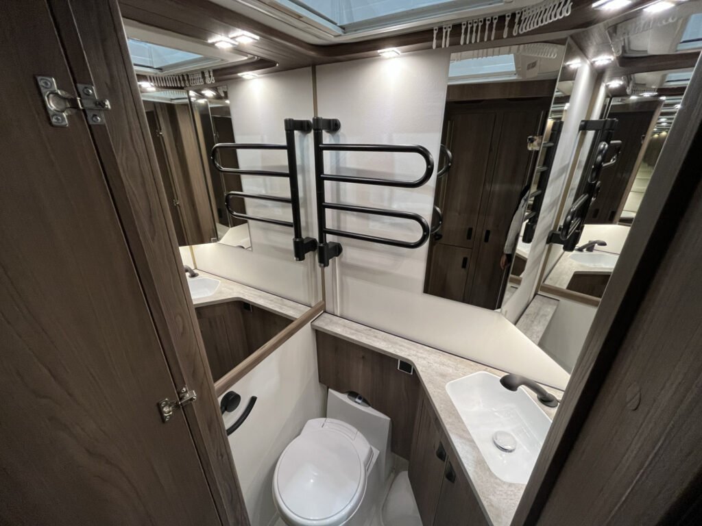Comfort paket: velká kompresorová lednice s mrazákem, opěrka hlavy u sezení, servisní úložný prostor, sušák na ručníky, elektricky nastavitelné čelo postele