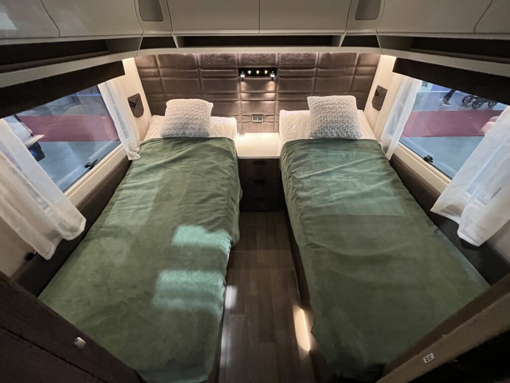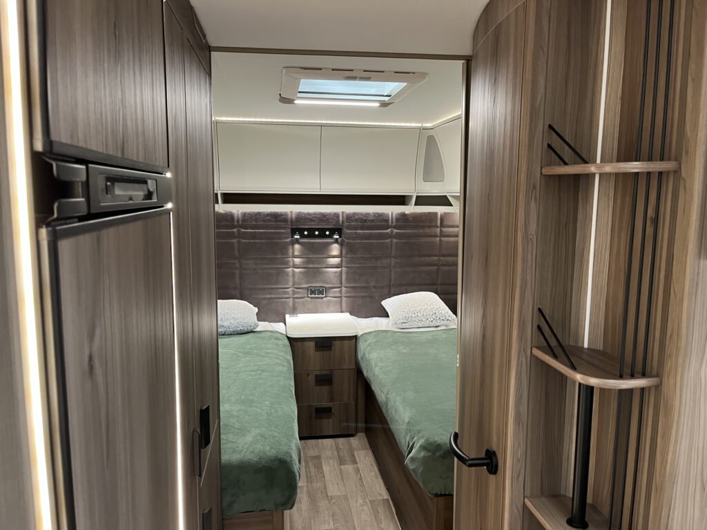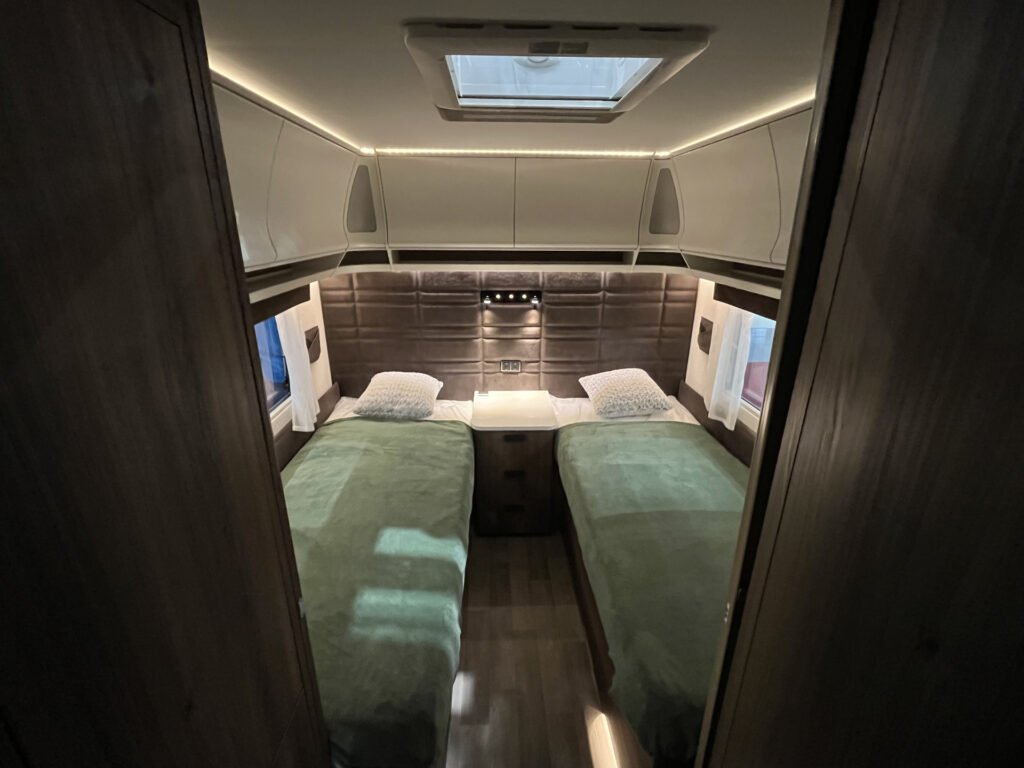 Luxusní karavan švédské výroby od prémiové značky Kabe skladem! Půdorys s oddělenými lůžky v zadní části, boční kuchyňkou a koupelnou uprostřed. Rozměr oddělených lůžek: 2 x 196 x 88 cm.
