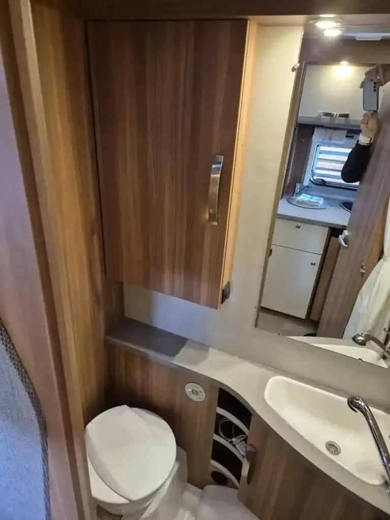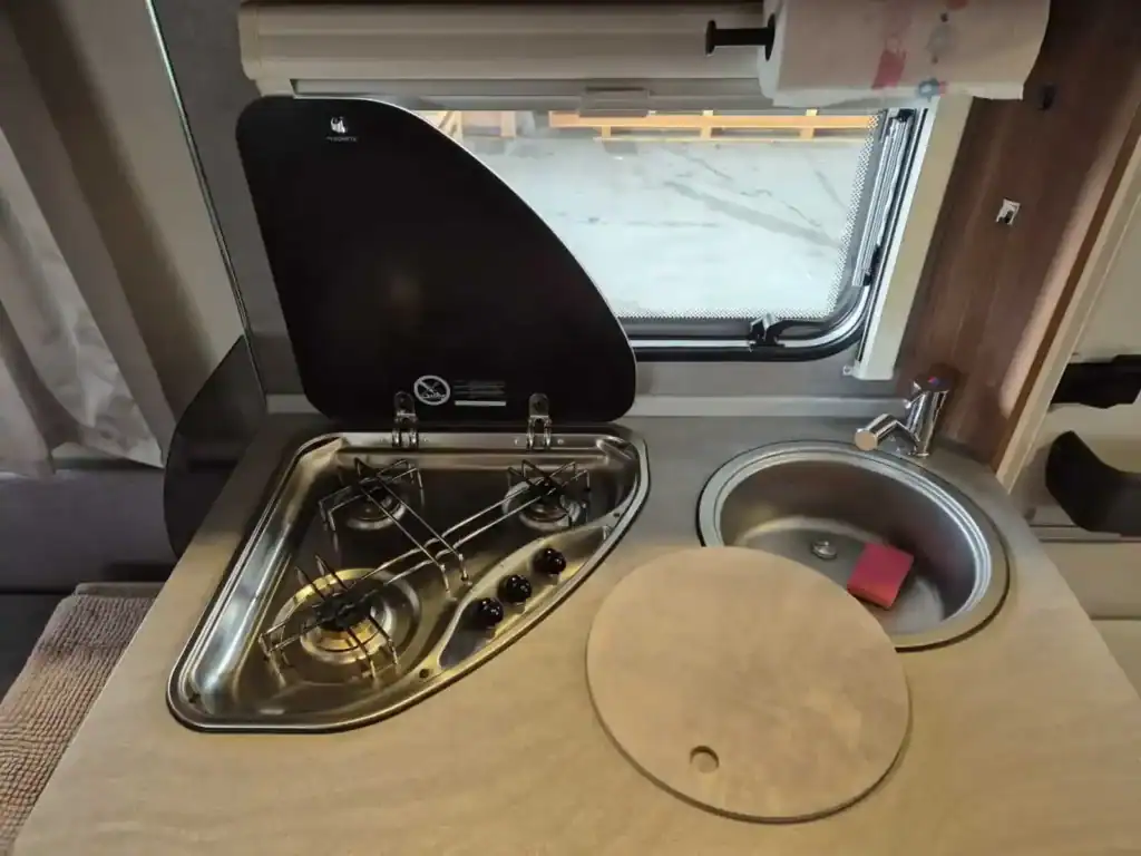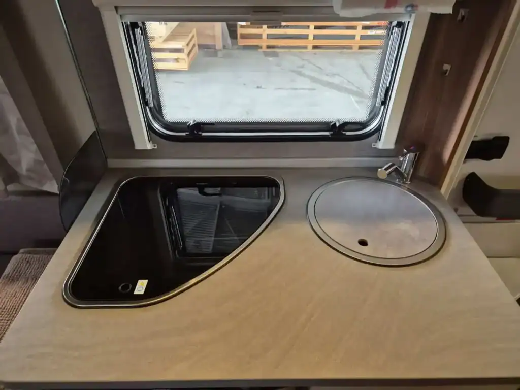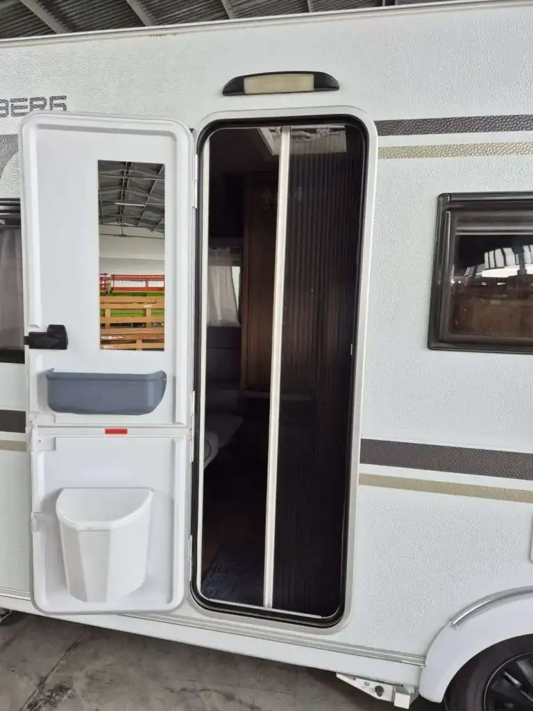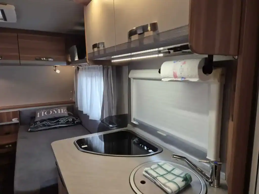 Prostorný karavan s francouzským lůžkem vpředu a rozkládacím „“U““ sezením vzadu. Výsuvný rošt mezi samostatnými lůžky (rozšíření lůžka vč. matrací)