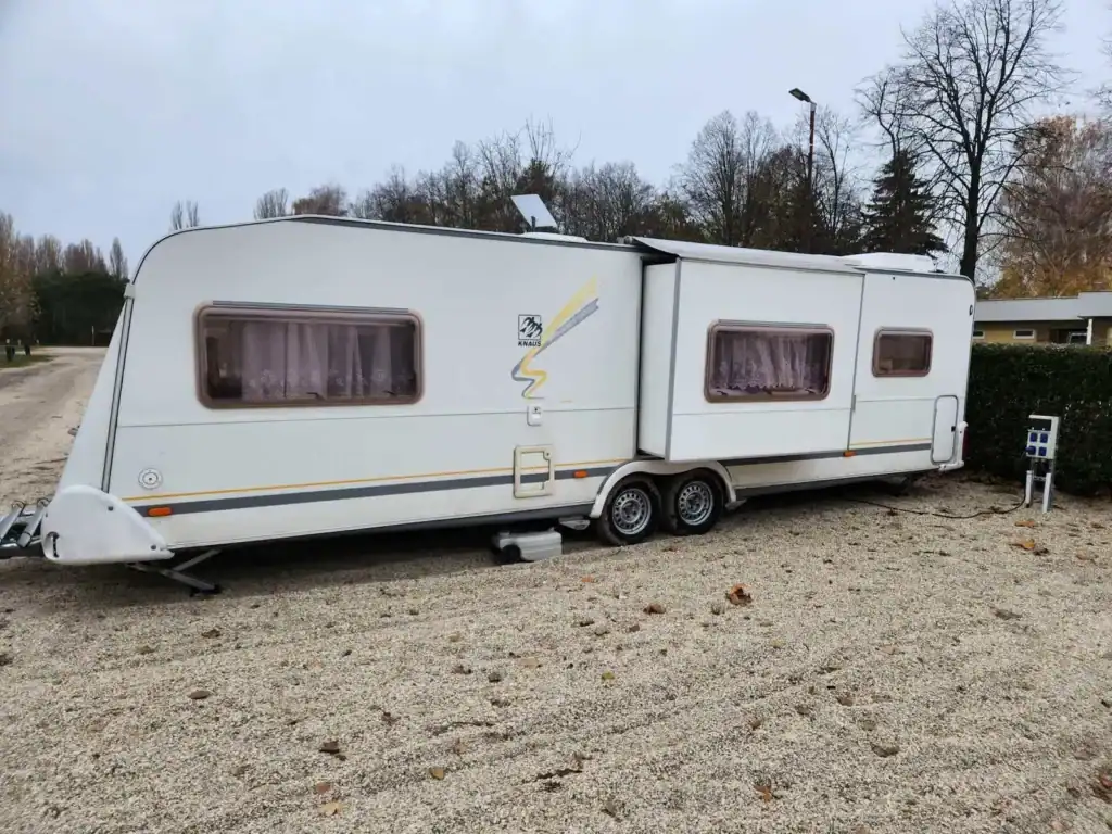Unikátní velký karavan 10,5m s ojí, dvouosý, s extra vychytávkou vysouvacím bokem, pro 5-6 osob. Ložnice s velkou manželskou postelí oddělená pevnými dveřmi, koupelna s umyvadlem a kazetovým WC, samostatná sprcha (!), obývací pokoj s posezením do U pro 4 a rozložením na spaní pro 2 + samostatné houpací křeslo, další sezení pro 2 se stolem a spaním pro 1, velká kuchyň do L s dřezem a 3-plotynkou, horkovzdušná mikrovlnka. Stropní klimatizace, solární panel na…