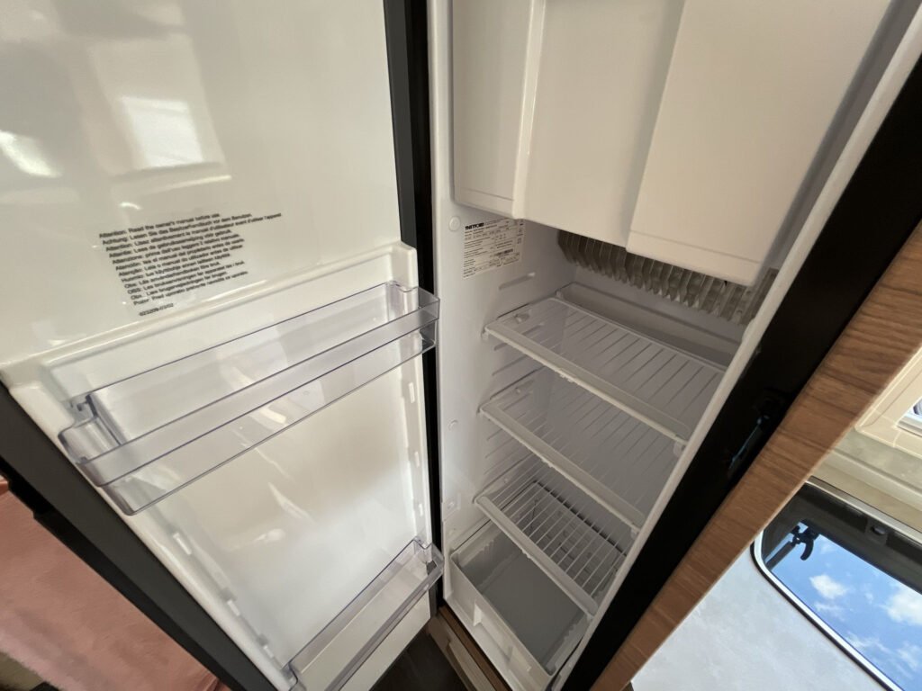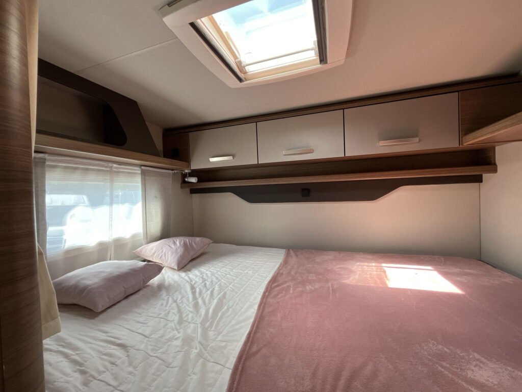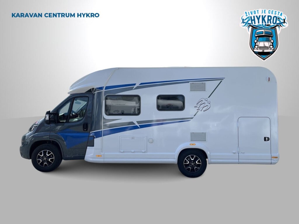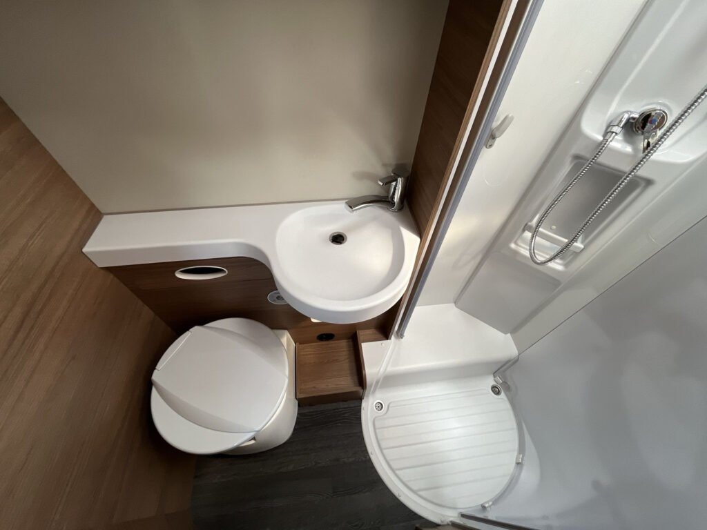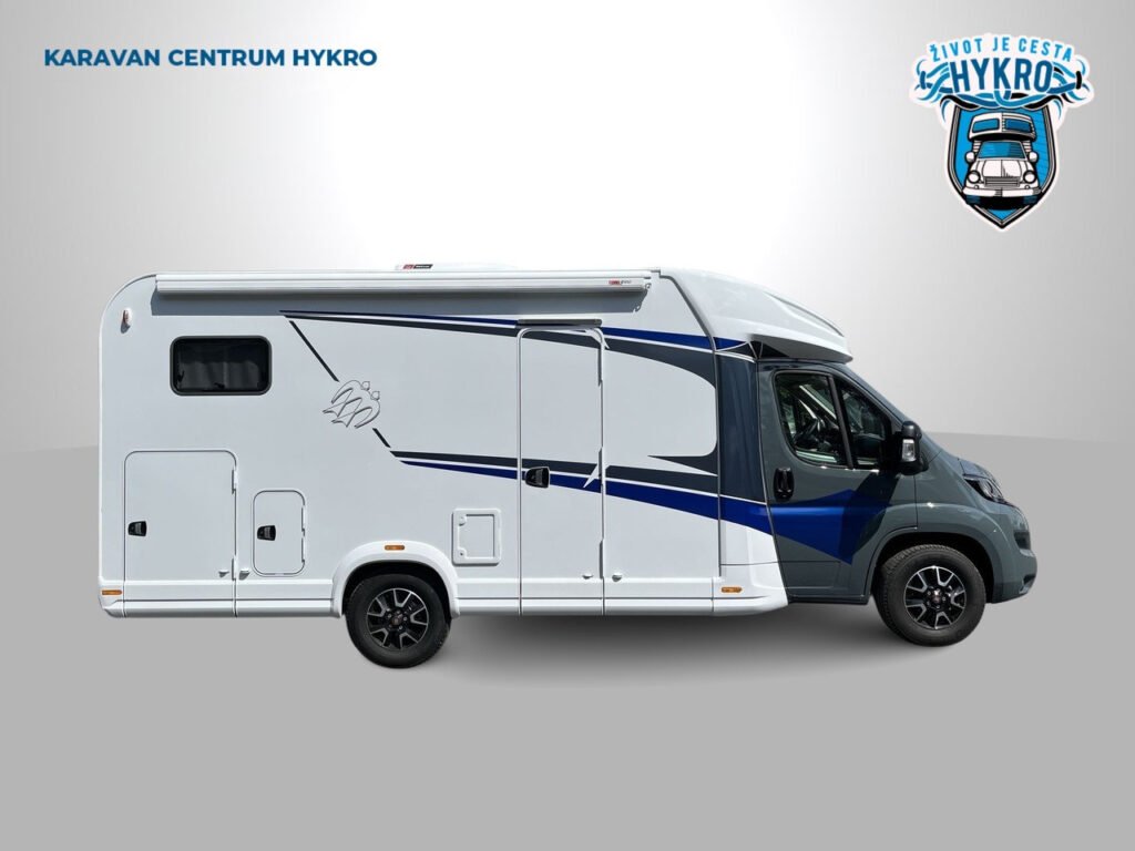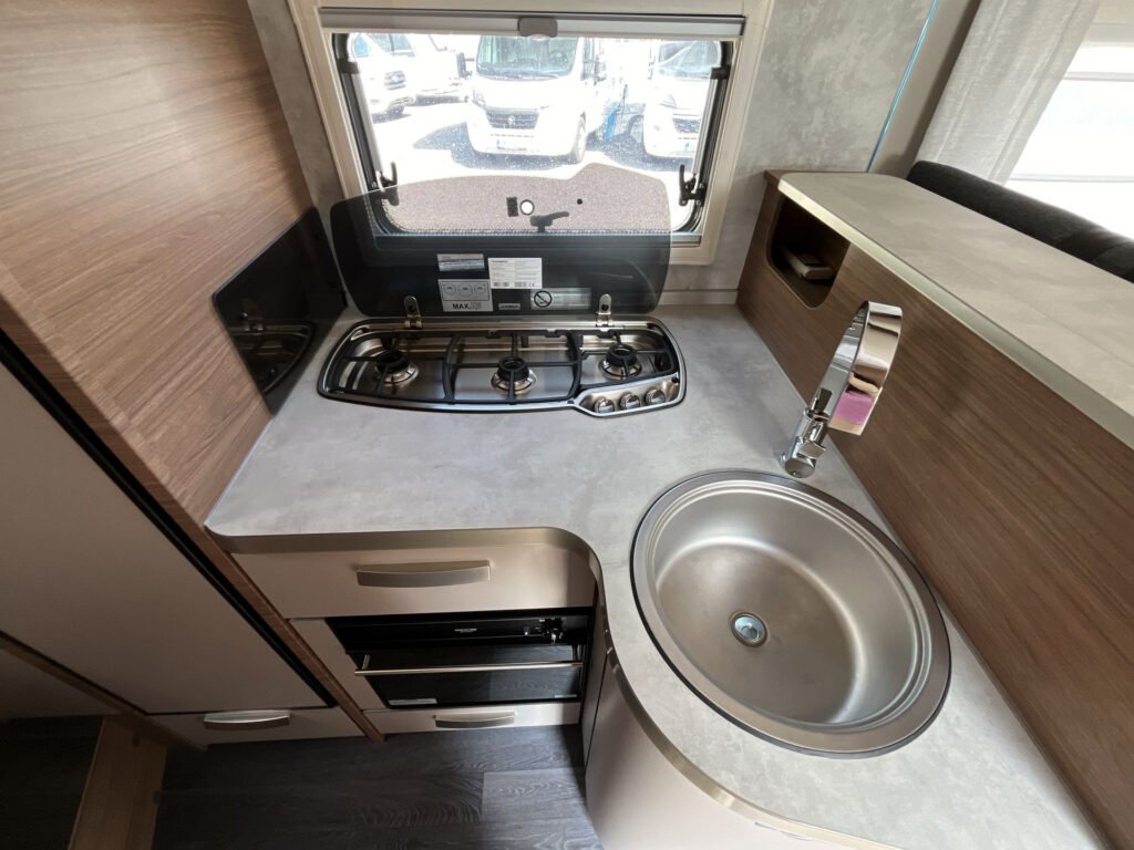 KUCHYŇKA + KOUPELNA: tříhořákový plynový vařič a nerezový dřez se skleněným krytem, kuchyňské zásuvky s funkcí soft-close, lednice 142 l se systémem AES, podélná prostorná koupelna se sprchovým koutem a umyvadlem, otočná kazetová toaleta Dometic