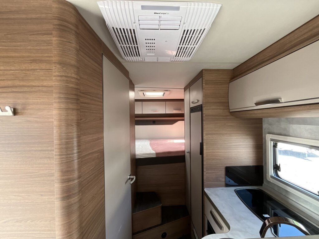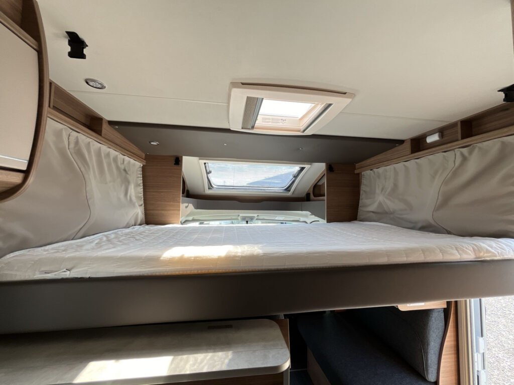 OBYTNÝ PROSTOR: skříňky úložného prostoru s funkcí soft-close, matrace EvoPore HRC, stahovací lůžko vpředu, čalounění Cool Grey