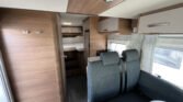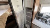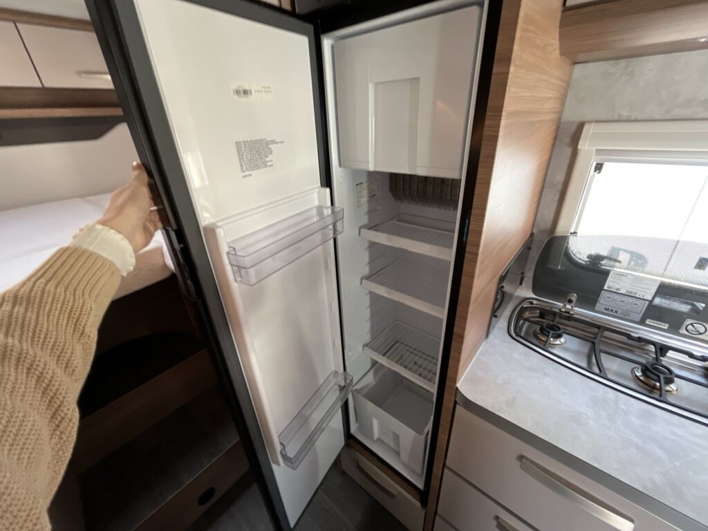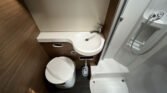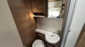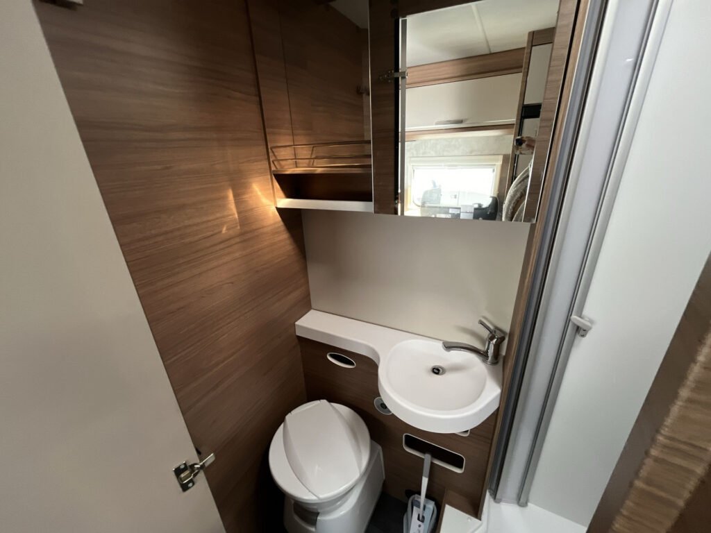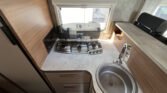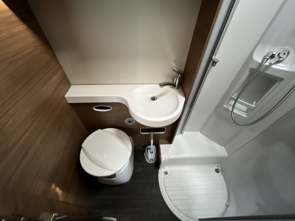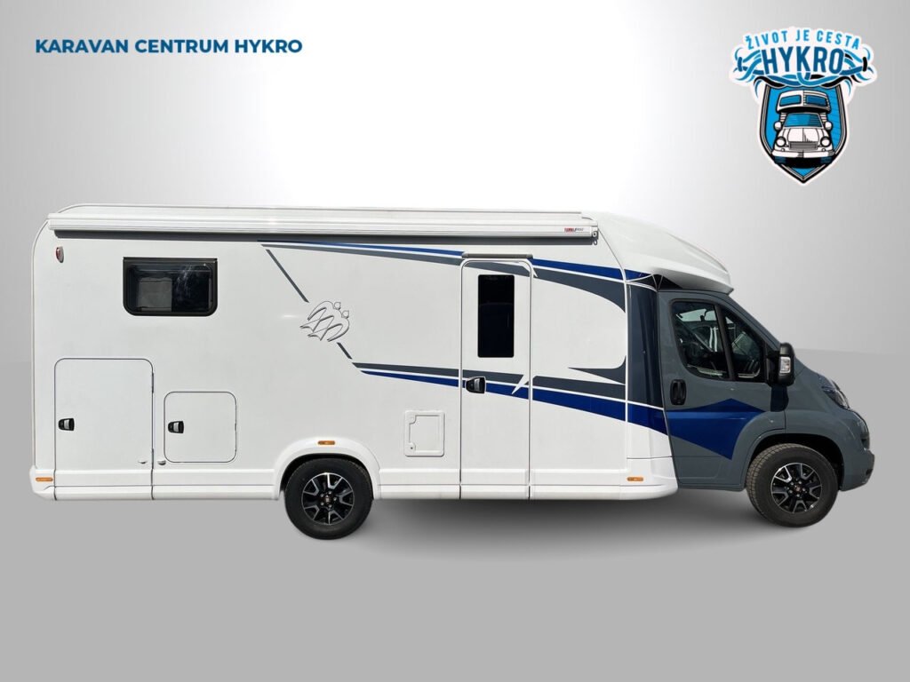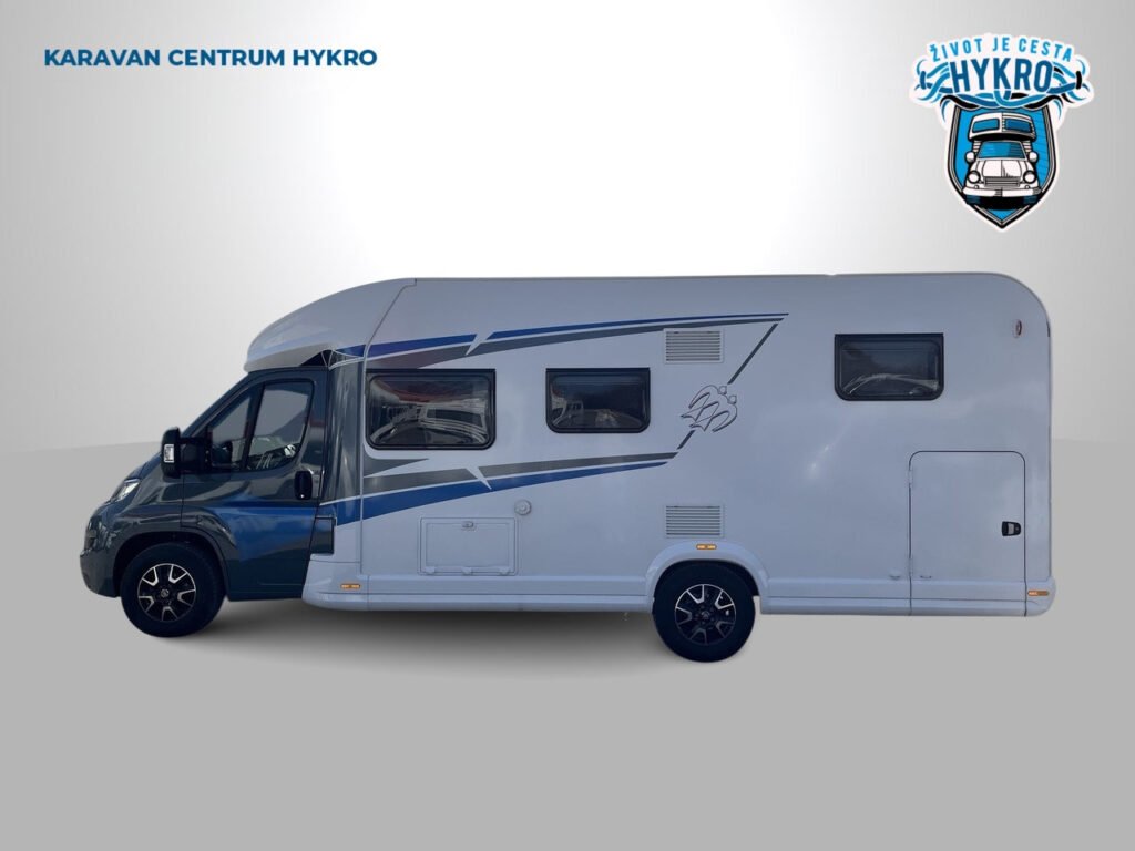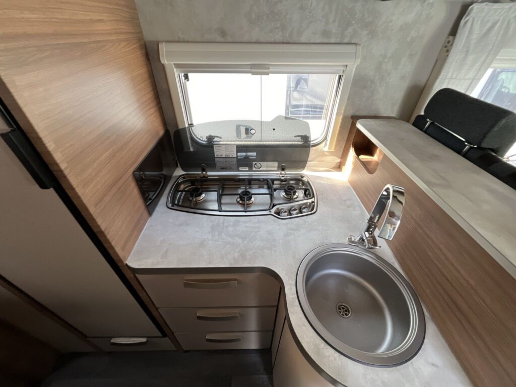KUCHYŇKA + KOUPELNA: tříhořákový plynový vařič a nerezový dřez se skleněným krytem, kuchyňské zásuvky s funkcí soft-close, lednice 142 l se systémem AES, podélná prostorná koupelna se sprchovým koutem a umyvadlem, otočná kazetová toaleta Dometic