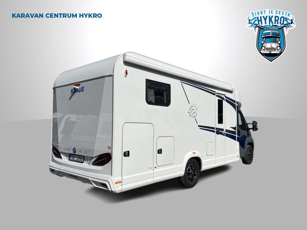 Luxusní polointegrovaný obytný vůz Knaus L!VE WAVE 700 MEG s bohatou výbavou a prostornou koupelnou.
