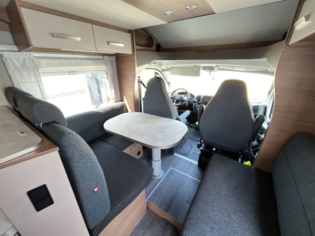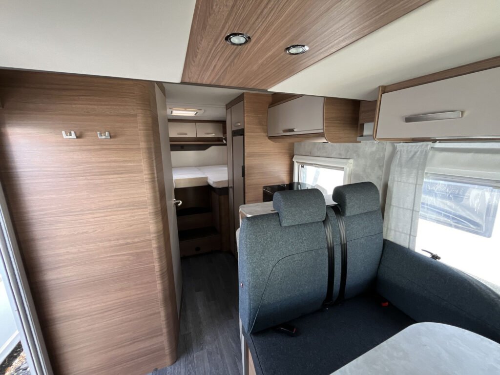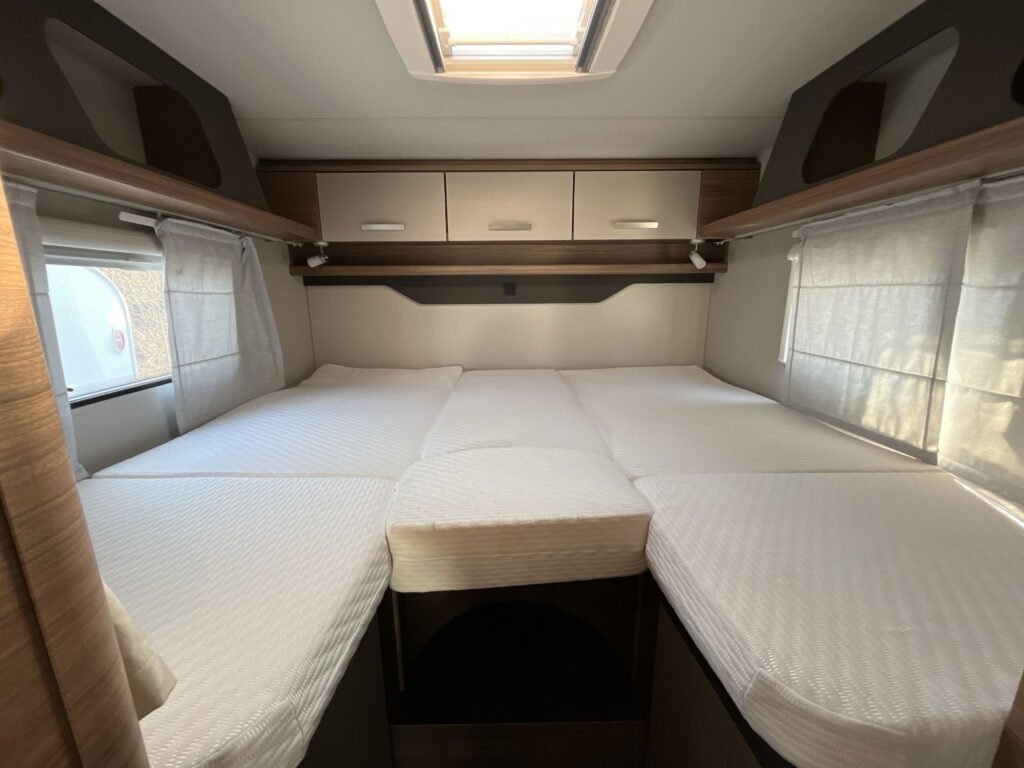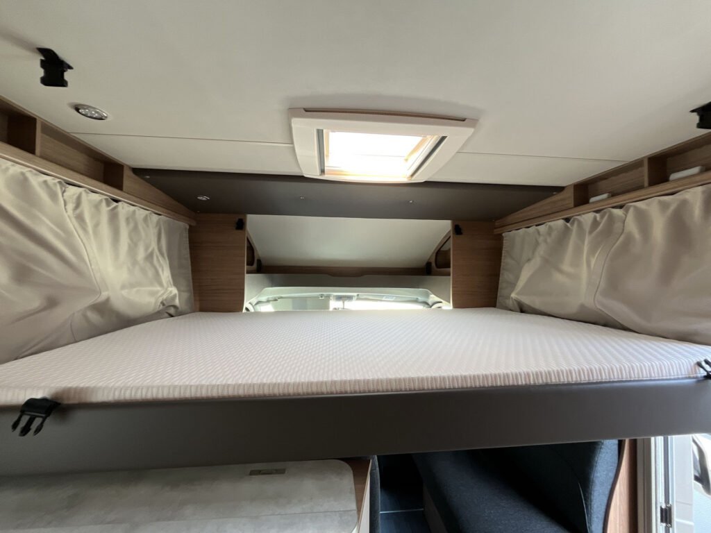 OBYTNÝ PROSTOR: skříňky úložného prostoru s funkcí soft-close, matrace EvoPore HRC, stahovací lůžko vpředu, čalounění Cool Grey