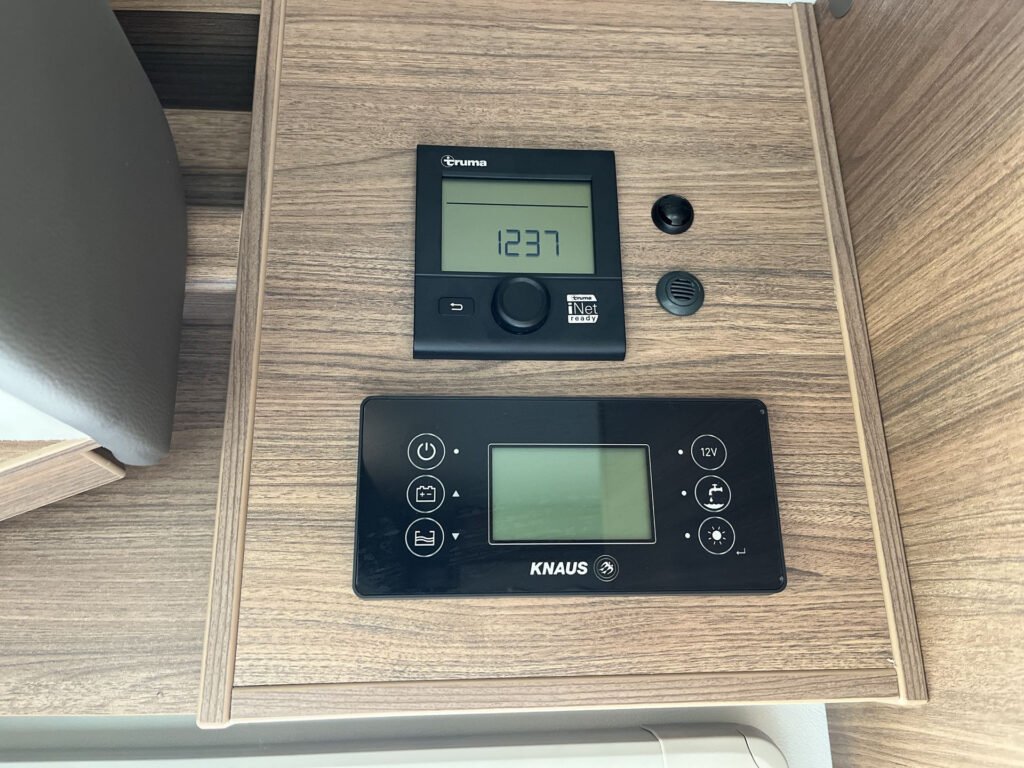 ELEKTRO A TECHNIKA: zadní LED světlo Knaus CATEYE Evolution, integrované třetí brzdové světlo, LED osvětlení markýzy s pohybovým senzorem, plynový systém 30 mbar, systém vzduchové cirkulace 12V, zásuvky 12V / USB / 230 V, vnitřní osvětlení (230 V / 12 V), booster k nástavbové baterii, dotykový ovládací panel