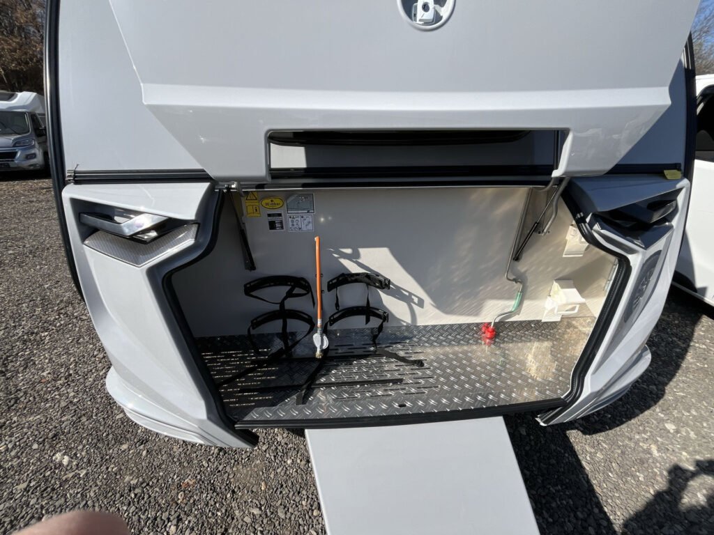 Další příplatková výbava v ceně: lité rezervní kolo vč. zvedáku a držáku na podvozku, digitální ovládací panel k topení Truma CP Plus, rozšíření pracovní desky v kuchyňce, rozšíření sedací soupravy (vč. možnosti rozložení na dvojlůžko)
