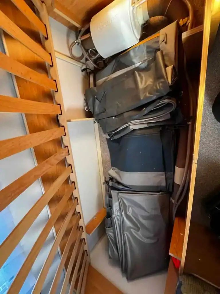 Skladován venku, ale pod plachtou, pravidelně jsme jej posouvali kvůli pneu. V několika chorvatských bouřích ověřeno, že do něj neteče a za to ručím. A co má a co…