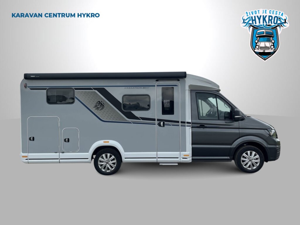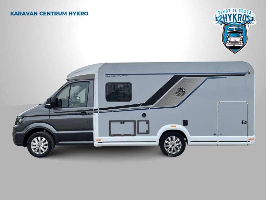 Edice Vansation již obsahuje levé garážové dveře, moskytiéru ve vstupních dveřích, střešní okno s kombinovanou roletkou, skříňka na plynovou láhev 5 kg, boční stěny z hladkého plechu v odstínu Campovolo Grau, potahy sedadel v kabině řidiče, barva podvozku Indium Grau, 17" litá kola "Lismore", lakovaný přední nárazník v šedé barvě, manuální klimatizace "Climatic", otočná sedadla v kabině řidiče, elektricky…