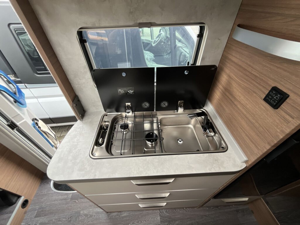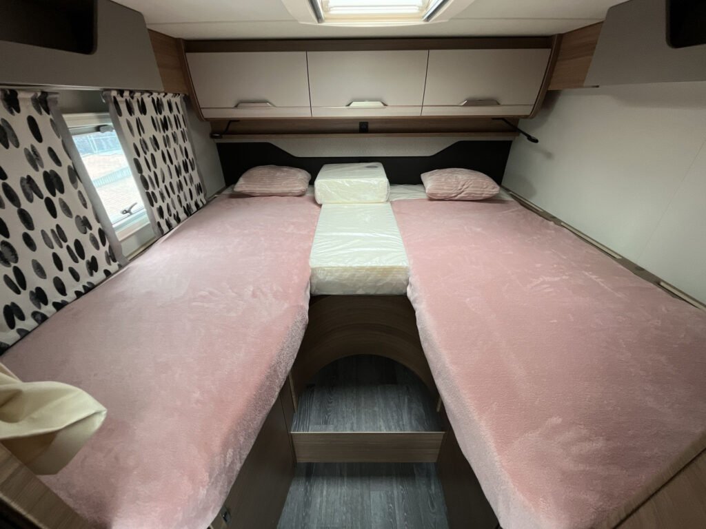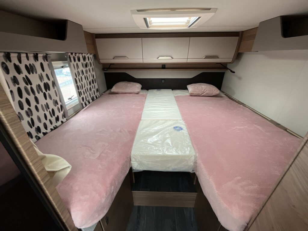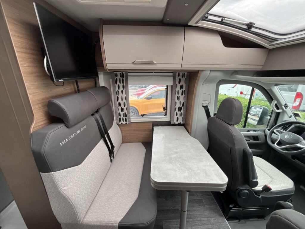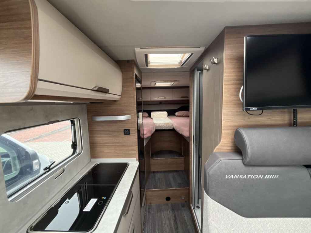 Edice Vansation již obsahuje levé garážové dveře, moskytiéru ve vstupních dveřích, střešní okno s kombinovanou roletkou, skříňka na plynovou láhev 5 kg, boční stěny z hladkého plechu v odstínu Campovolo Grau, potahy sedadel v kabině řidiče, barva podvozku Indium Grau, 17″ litá kola „Lismore“, lakovaný přední nárazník v šedé barvě, manuální klimatizace „Climatic“, otočná sedadla v kabině řidiče, elektricky stavitelná a vyhřívaná zpětná zrcátka, digitální rádio (DAB+), extra USB zásuvka 230 V v kuchyňce, držák TV, příprava pro TV, stmívatelné ambientní osvětlení, 27″ SMART TV s HD tunerem, externí LTE / W-LAN anténa, ovládací panel Truma CP-PLUS, izolovaná a vyhřívaná odpadní nádrž, markýza 405 x 250 cm antracit, COZY HOME PAKET v odstínu Peach, střešní okno 70×50 cm v zadní části, výsuv mezi oddělenými lůžky, polstrování WINTER WHITE „Vansation“, zatemňovací roletky v kabině řidiče REMIS
