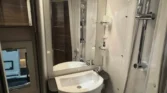 Prostorná koupelna se sprchovým koutem, dveře oddělující ložnici.