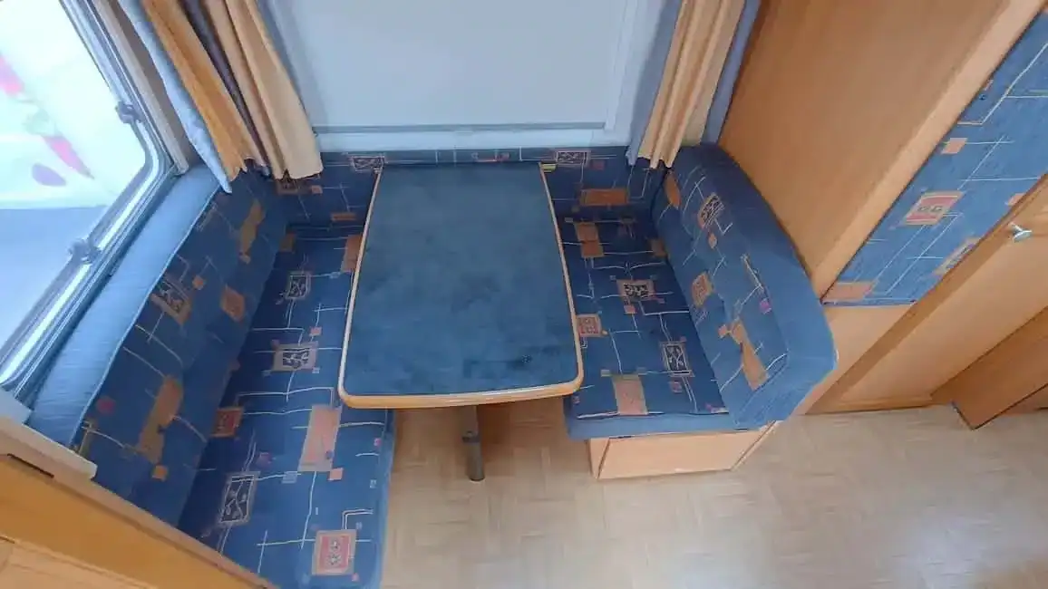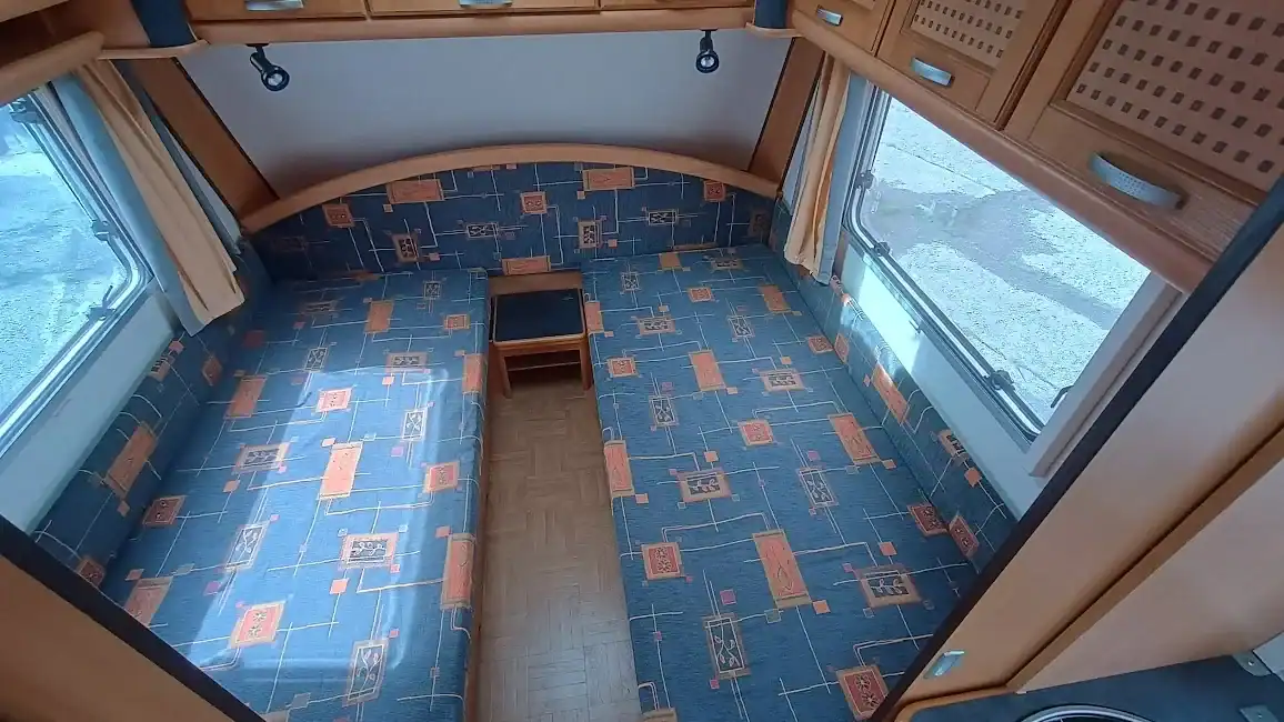 Dispozice: Vzadu rozkládací sezení, které je možno složit na spaní, vedle něj šatní a odkládací skříň + topení. Uprostřed kuchyňka s dřezem, vařičem se 3 plotýnkami, lednicí, odkládací skříňka + šuplík na příbory. Naproti koupelna s chemickým WC. Vpředu 2 x dělené lůžko, které je možno složit na letišťe. 4x střešní okno – vzadu, uprostřed, v koupelně, v ložnici.