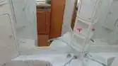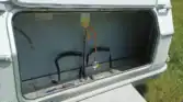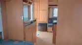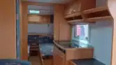 Dispozice: Vzadu rozkládací sezení, které je možno složit na spaní, vedle něj šatní a odkládací skříň + topení. Uprostřed kuchyňka s dřezem, vařičem se 3 plotýnkami, lednicí, odkládací skříňka + šuplík na příbory. Naproti koupelna s chemickým WC. Vpředu 2 x dělené lůžko, které je možno složit na letišťe. 4x střešní okno – vzadu, uprostřed, v koupelně, v ložnici.