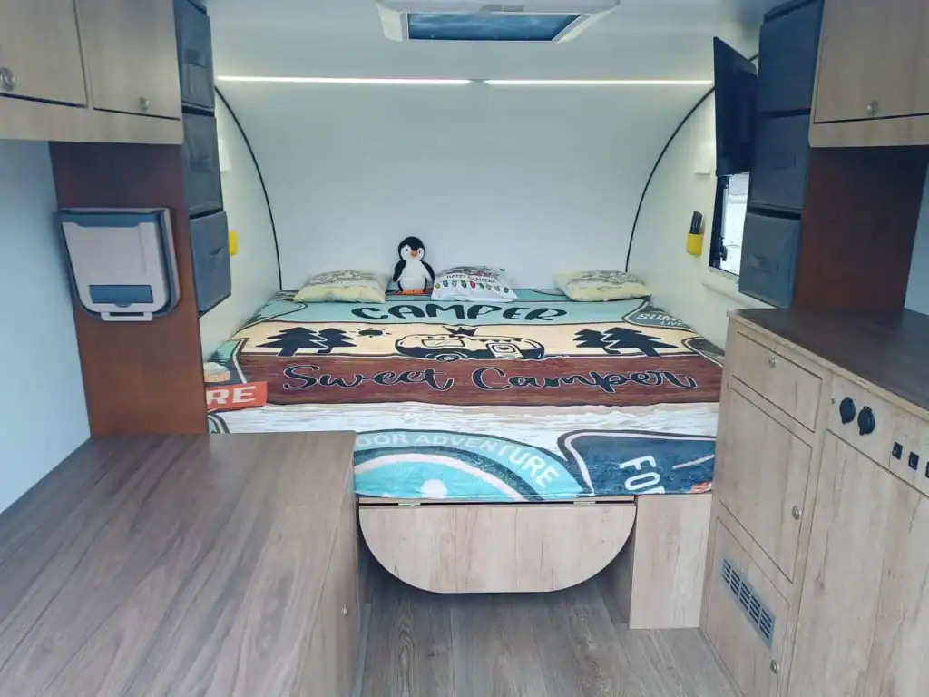 Prodám minikaravan Mini K Family od Carox+. Vyrobeno a uvedeno do provozu 6/2024. Jezdili jsme s ním dvě letní sezóny a nyní chceme přejít na obytnou dodávku. Letos v červnu proběhla garanční prohlídka karavanu u výrobce. Jezdí se s ním velmi dobře nejsou potřeba nástavce na zpětná zrcátka, homologace na 130 km/h. Přidám přístřešek před karavan ze stanoviny do kedrové lišty Váha je do 750 kg, bržděná náprava, výška 2040 mm, šířka 2010 mm, délka 4200 mm, velikost lůžka 1780 x 2000 mm, alu disky 14, 2 x boční okno s roletou a moskytiérou, střešní okno s roletou a moskytiérou, stabilizační nohy, sedací úprava, solární komplet 175Wp BlueSmart, trakční baterie 105Ah, led osvětlení, připojení na 230V, zásuvka 230V, autozásuvka, 2 x USB, karavan vybaven 13 pin zástrčkou, na oji hliníkový uzamykatelný box na příslušenství