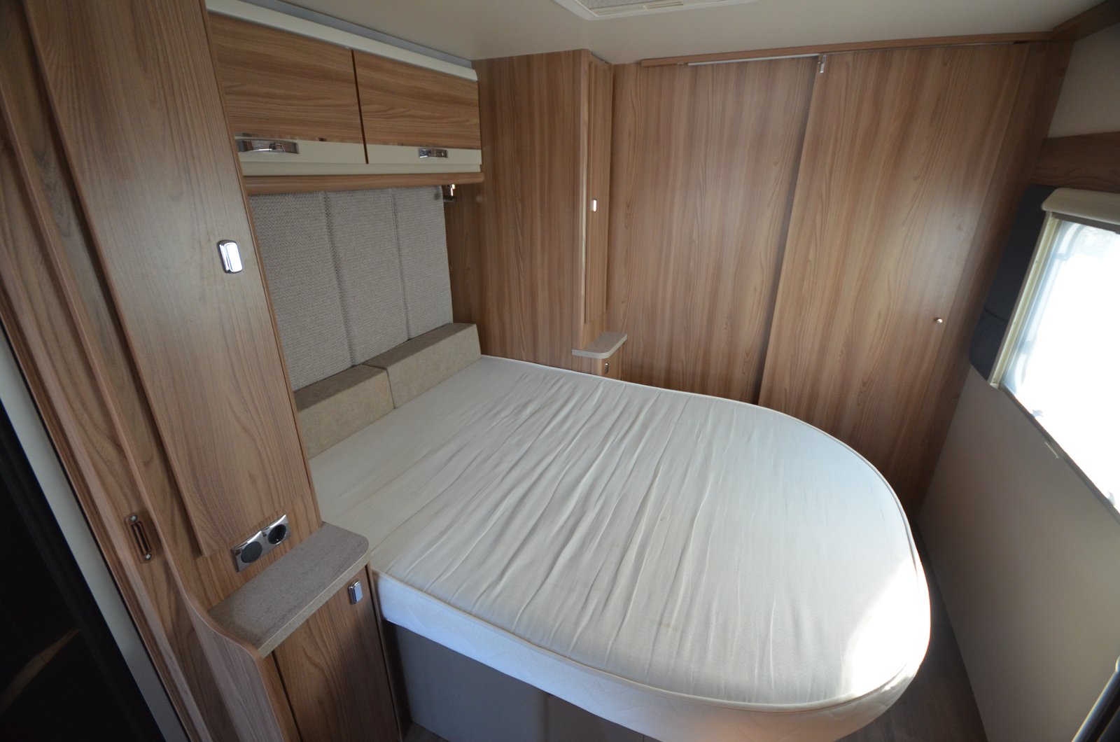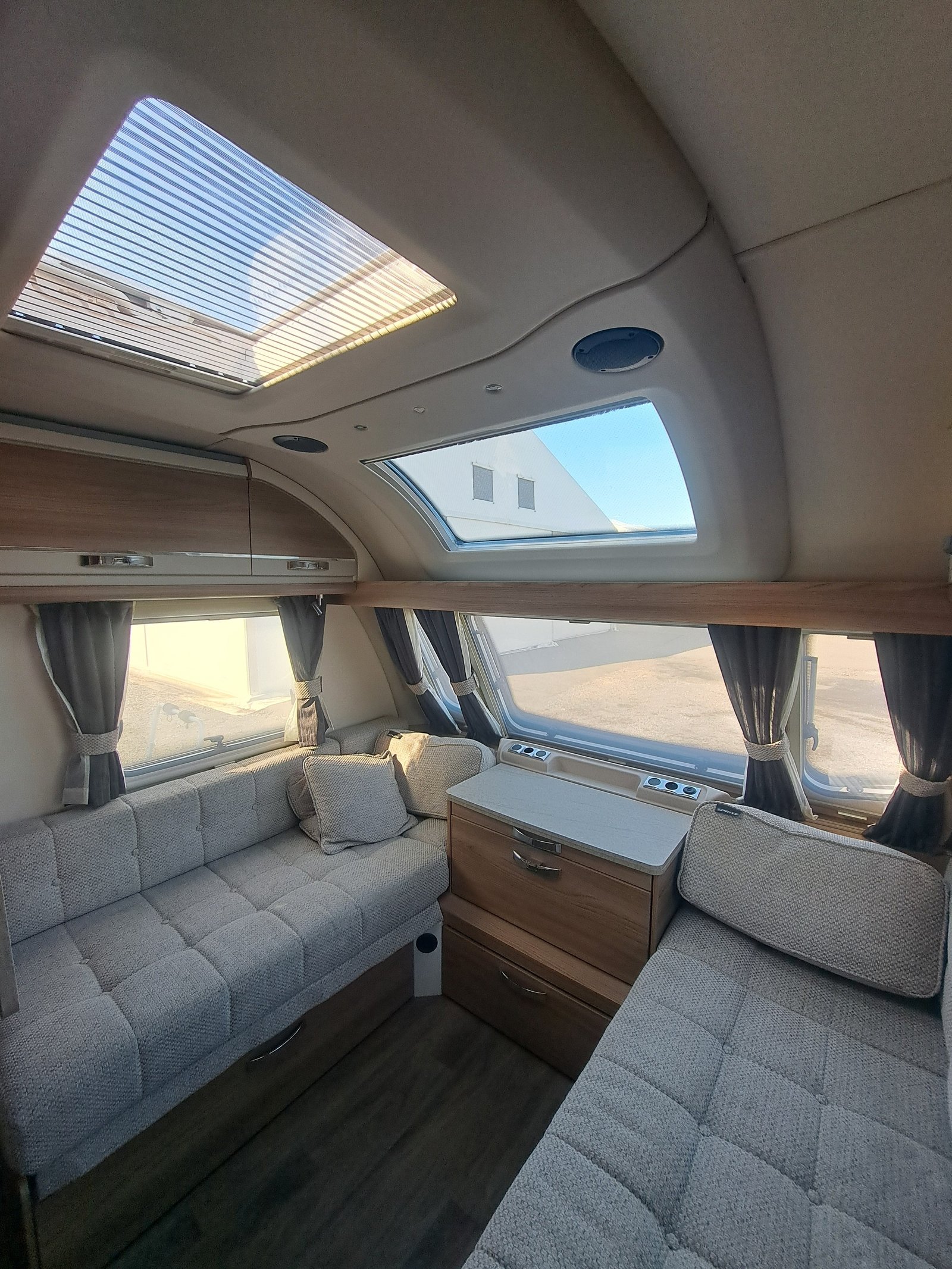 Britský karavan Swift Sprite Cruzer 550 SR nabízí komfortní dispozici vhodnou pro páry i rodiny. Dominantou interiéru je manželské lůžko umístěné ve střední části karavanu, které poskytuje pohodlné spaní bez nutnosti každodenního rozkládání. V zadní části se nachází prostorná koupelna přes celou šířku karavanu se sprchovým koutem, chemickou toaletou a samostatným umyvadlem. Díky tomu nabízí Cruzer 550 SR velmi praktické a pohodlné zázemí pro cestování i delší pobyty.