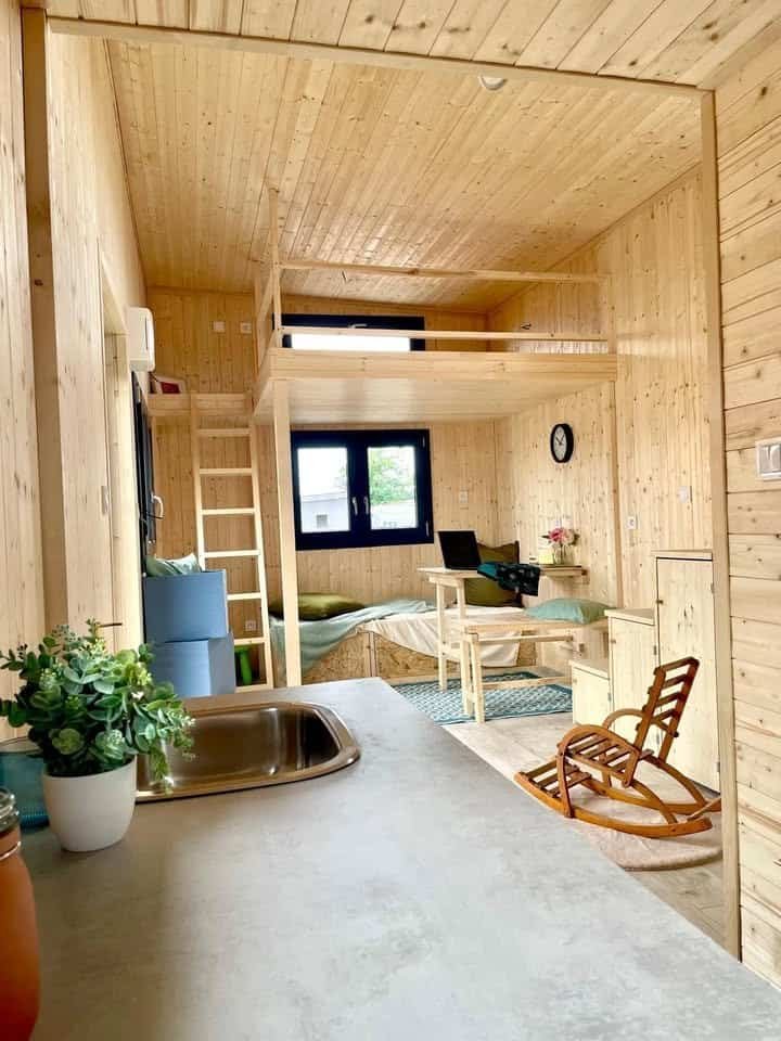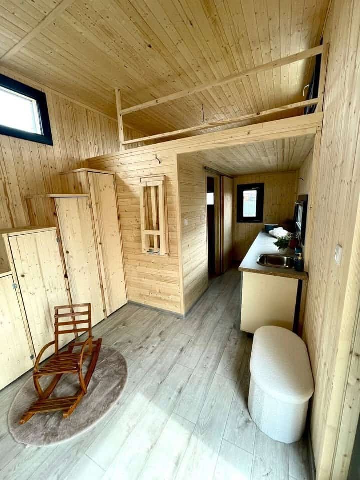 Díky těmto parametrům se dům skvěle hodí jako alternativní trvalé bydlení, víkendová chata nebo dokonce mobilní kancelář či ateliér. Kuchyňská linka s varnou deskou, dřezem (by Oresi), podlahové topení, vinylová podlahová krytina. Vybavená koupelna, 2x lofty na spaní.