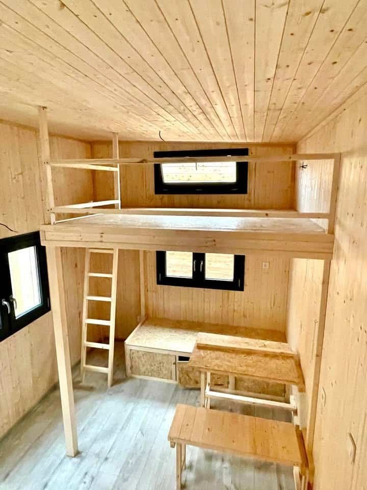 Tiny House o rozměrech 8 × 3,2 metru, který zaujme nejen svým provedením, ale i ekologickým přístupem, chytrým využitím prostoru a přípravou na celoroční bydlení. 20 cm konopné izolace ve stěnách – přírodní, zdravá a udržitelná volba Polystyrenová izolace podlahy – 5 cm shora, 10 cm zespodu + OSB záklop Zateplený strop a střecha – samozřejmost pro celoroční provoz