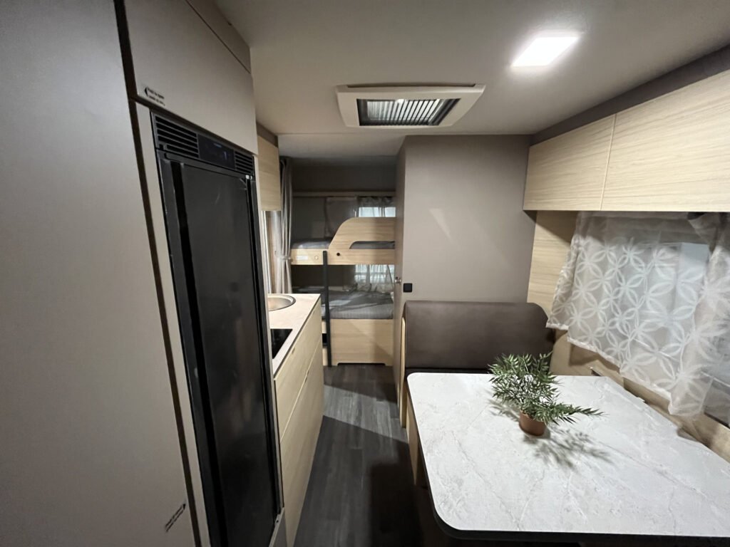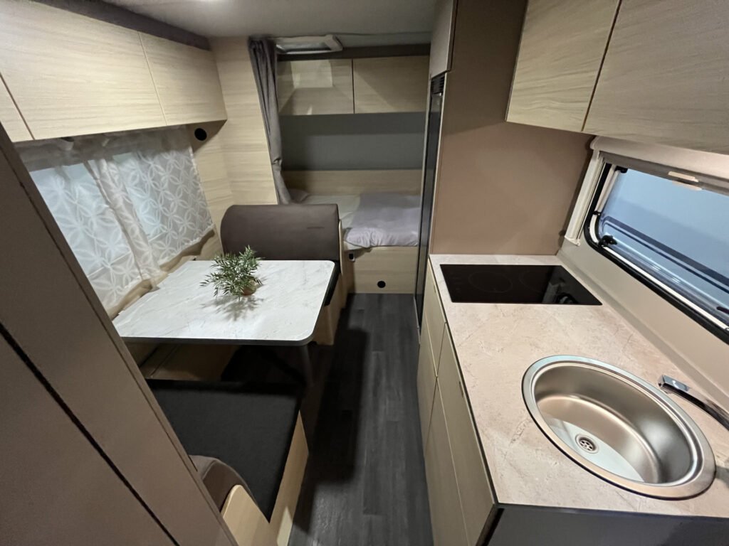Elektrický rodinný přívěs s příčným lůžkem a palandami.