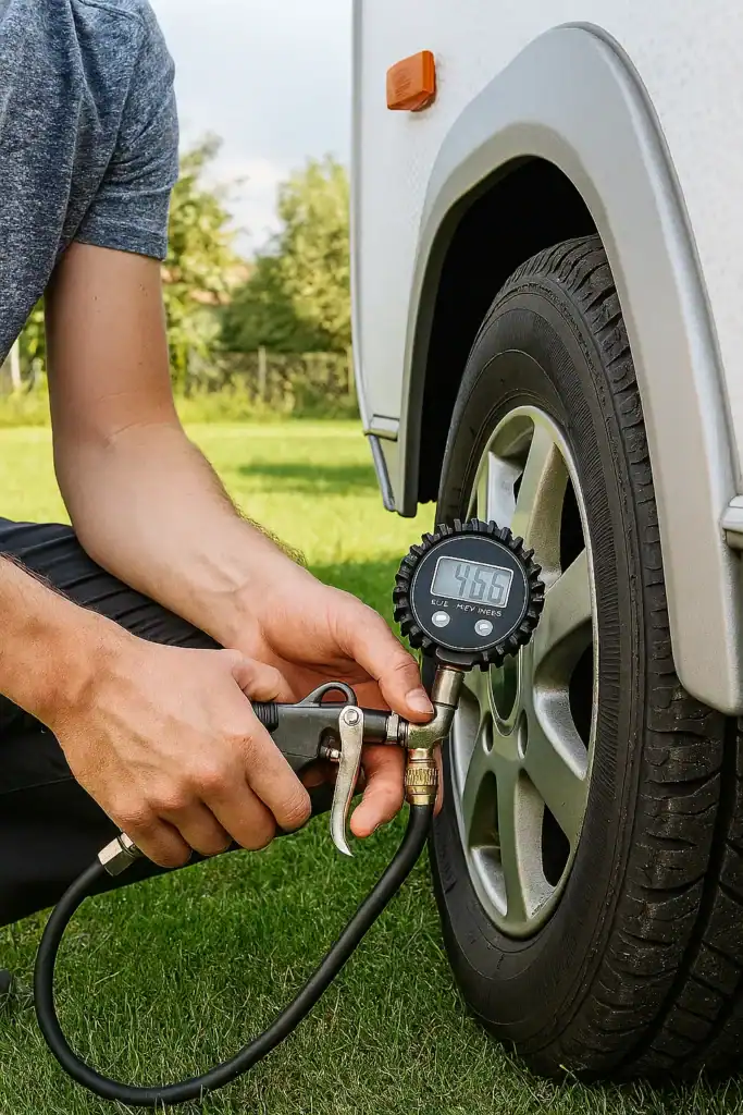 Vzhledem k vysokým tlakům (až 5,5 Bar a nutnosti přesnosti se doporučuje používat vlastní digitální manometr, který zvládá vysoké hodnoty a je spolehlivý. Nepřesnost 0,5 Baru může mít u karavanu mnohem závažnější důsledky než u osobního vozu.